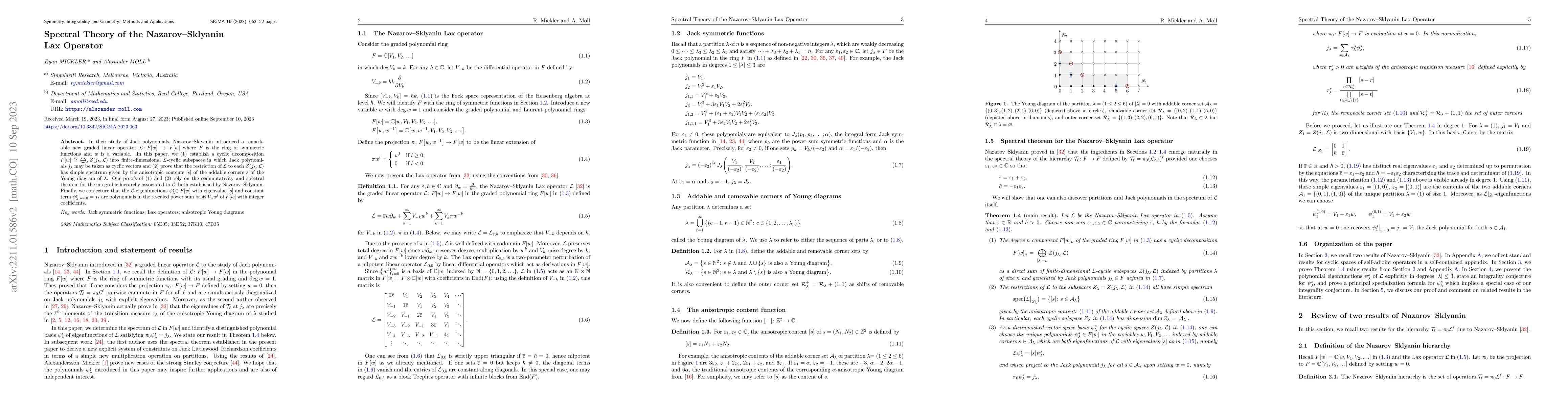 In their study of Jack polynomials, Nazarov-Sklyanin introduced a remarkable new graded linear operator ${\mathcal L} \colon F[w] \rightarrow F[w]$ where $F$ is the ring of symmetric functions and $w$ is a variable. In this paper, we (1) establish a cyclic decomposition $F[w] \cong \bigoplus_{\lambda} Z(j_{\lambda}, {\mathcal L})$ into finite-dimensional ${\mathcal L}$-cyclic subspaces in which Jack polynomials $j_{\lambda}$ may be taken as cyclic vectors and (2) prove that the restriction of ${\mathcal L}$ to each $Z(j_{\lambda}, {\mathcal L})$ has simple spectrum given by the anisotropic contents $[s]$ of the addable corners $s$ of the Young diagram of $\lambda$. Our proofs of (1) and (2) rely on the commutativity and spectral theorem for the integrable hierarchy associated to ${\mathcal L}$, both established by Nazarov-Sklyanin. Finally, we conjecture that the ${\mathcal L}$-eigenfunctions $\psi_{\lambda}^s {\in F[w]}$ {with eigenvalue $[s]$ and constant term} $\psi_{\lambda}^s|_{w=0} = j_{\lambda}$ are polynomials in the rescaled power sum basis $V_{\mu} w^l$ of $F[w]$ with integer coefficients.