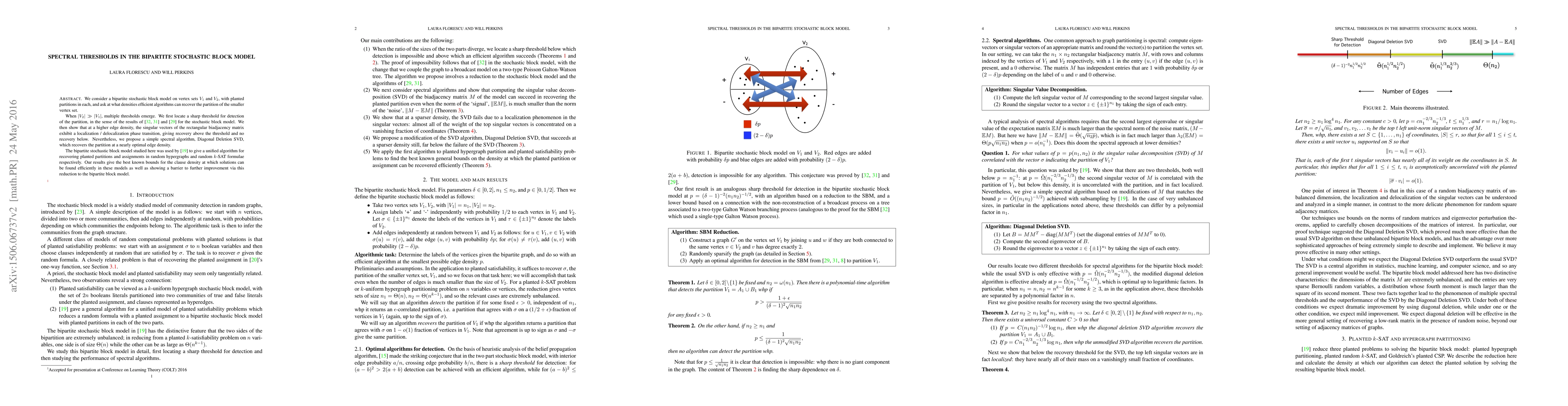 We consider a bipartite stochastic block model on vertex sets $V_1$ and $V_2$, with planted partitions in each, and ask at what densities efficient algorithms can recover the partition of the smaller vertex set. When $|V_2| \gg |V_1|$, multiple thresholds emerge. We first locate a sharp threshold for detection of the partition, in the sense of the results of \cite{mossel2012stochastic,mossel2013proof} and \cite{massoulie2014community} for the stochastic block model. We then show that at a higher edge density, the singular vectors of the rectangular biadjacency matrix exhibit a localization / delocalization phase transition, giving recovery above the threshold and no recovery below. Nevertheless, we propose a simple spectral algorithm, Diagonal Deletion SVD, which recovers the partition at a nearly optimal edge density. The bipartite stochastic block model studied here was used by \cite{feldman2014algorithm} to give a unified algorithm for recovering planted partitions and assignments in random hypergraphs and random $k$-SAT formulae respectively. Our results give the best known bounds for the clause density at which solutions can be found efficiently in these models as well as showing a barrier to further improvement via this reduction to the bipartite block model.