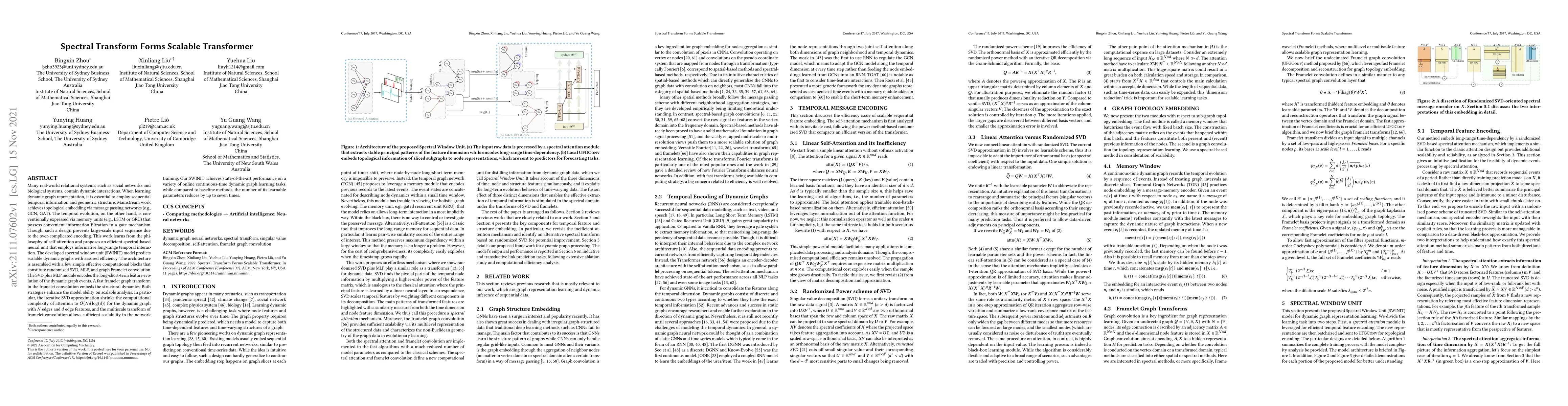 Many real-world relational systems, such as social networks and biological systems, contain dynamic interactions. When learning dynamic graph representation, it is essential to employ sequential temporal information and geometric structure. Mainstream work achieves topological embedding via message passing networks (e.g., GCN, GAT). The temporal evolution, on the other hand, is conventionally expressed via memory units (e.g., LSTM or GRU) that possess convenient information filtration in a gate mechanism. Though, such a design prevents large-scale input sequence due to the over-complicated encoding. This work learns from the philosophy of self-attention and proposes an efficient spectral-based neural unit that employs informative long-range temporal interaction. The developed spectral window unit (SWINIT) model predicts scalable dynamic graphs with assured efficiency. The architecture is assembled with a few simple effective computational blocks that constitute randomized SVD, MLP, and graph Framelet convolution. The SVD plus MLP module encodes the long-short-term feature evolution of the dynamic graph events. A fast framelet graph transform in the framelet convolution embeds the structural dynamics. Both strategies enhance the model's ability on scalable analysis. In particular, the iterative SVD approximation shrinks the computational complexity of attention to O(Nd\log(d)) for the dynamic graph with N edges and d edge features, and the multiscale transform of framelet convolution allows sufficient scalability in the network training. Our SWINIT achieves state-of-the-art performance on a variety of online continuous-time dynamic graph learning tasks, while compared to baseline methods, the number of its learnable parameters reduces by up to seven times.