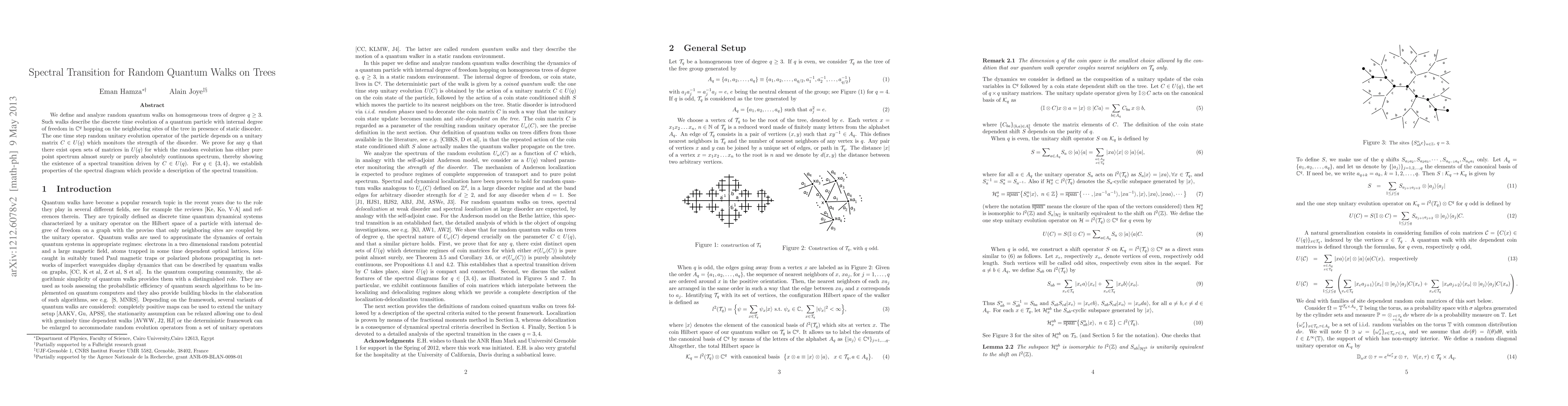 This paper analyzes random quantum walks on homogeneous trees, demonstrating a spectral transition based on unitary matrices. It proves the existence of either pure point or continuous spectra depending on matrix $C$, showcasing a spectral transition driven by the disorder strength.