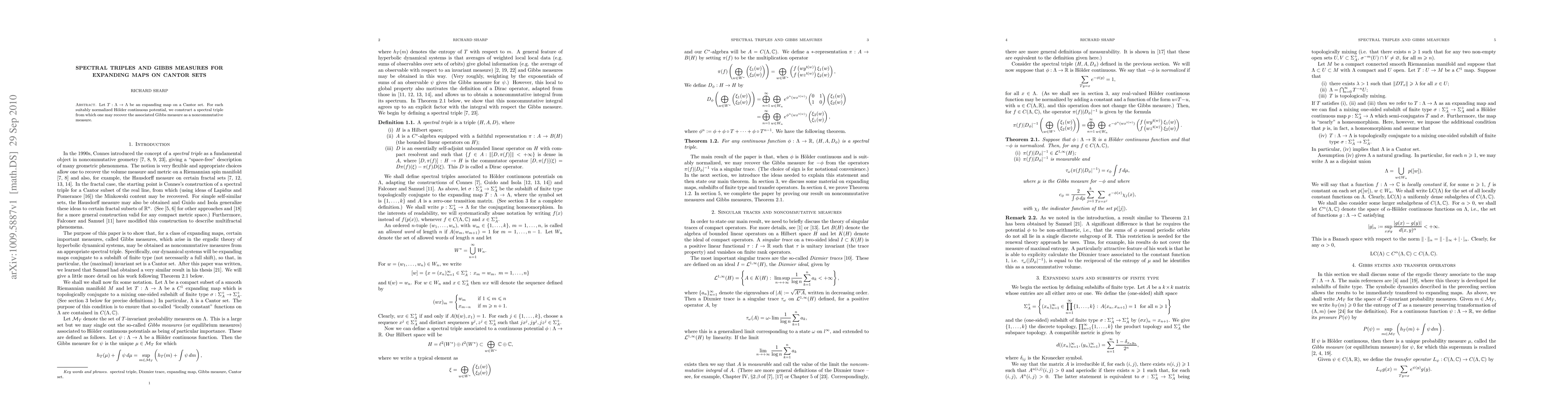 Let $T : \Lambda \to \Lambda$ be an expanding map on a Cantor set. For each suitably normalized H\"older continuous potential, we construct a spectral triple from which one may recover the associated Gibbs measure as a noncommutative measure.