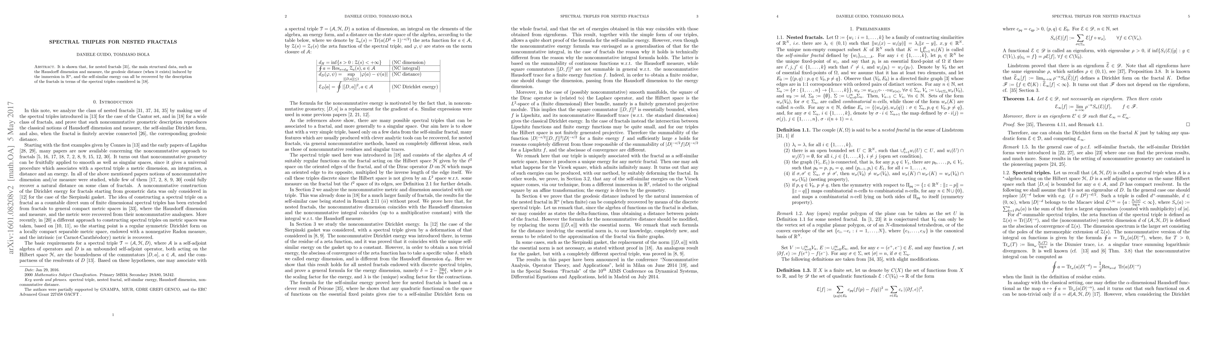 This paper demonstrates that spectral triples can recover key structural data of nested fractals, including Hausdorff dimension, geodesic distance, and self-similar energy, as originally described in earlier works by Lindstrom and Guido, Tisola.