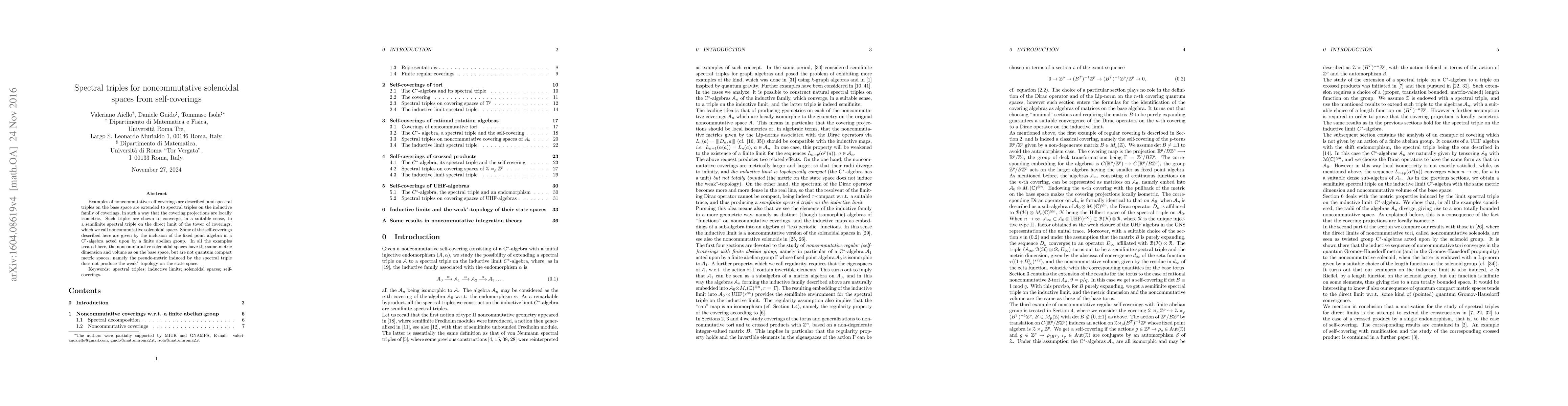 Examples of noncommutative self-coverings are described, and spectral triples on the base space are extended to spectral triples on the inductive family of coverings, in such a way that the covering projections are locally isometric. Such triples are shown to converge, in a suitable sense, to a semifinite spectral triple on the direct limit of the tower of coverings, which we call noncommutative solenoidal space. Some of the self-coverings described here are given by the inclusion of the fixed point algebra in a C$^*$-algebra acted upon by a finite abelian group. In all the examples treated here, the noncommutative solenoidal spaces have the same metric dimension and volume as on the base space, but are not quantum compact metric spaces, namely the pseudo-metric induced by the spectral triple does not produce the weak$^*$ topology on the state space.
