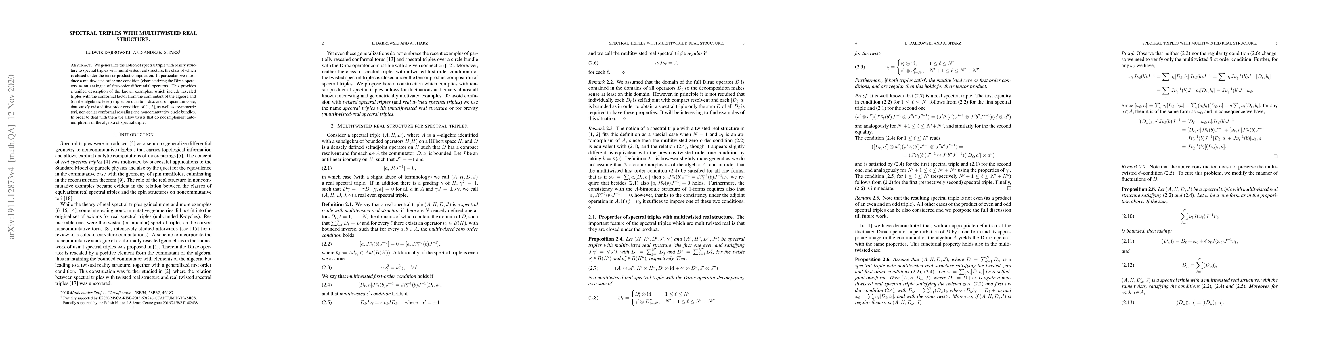 This paper generalizes spectral triples to include multitwisted real structures, introducing a new multitwisted first-order condition to characterize Dirac operators. This approach unifies various known examples, including quantum disc and cone triples, asymmetric tori, and noncommutative circle bundles, by allowing for non-implementing twists.