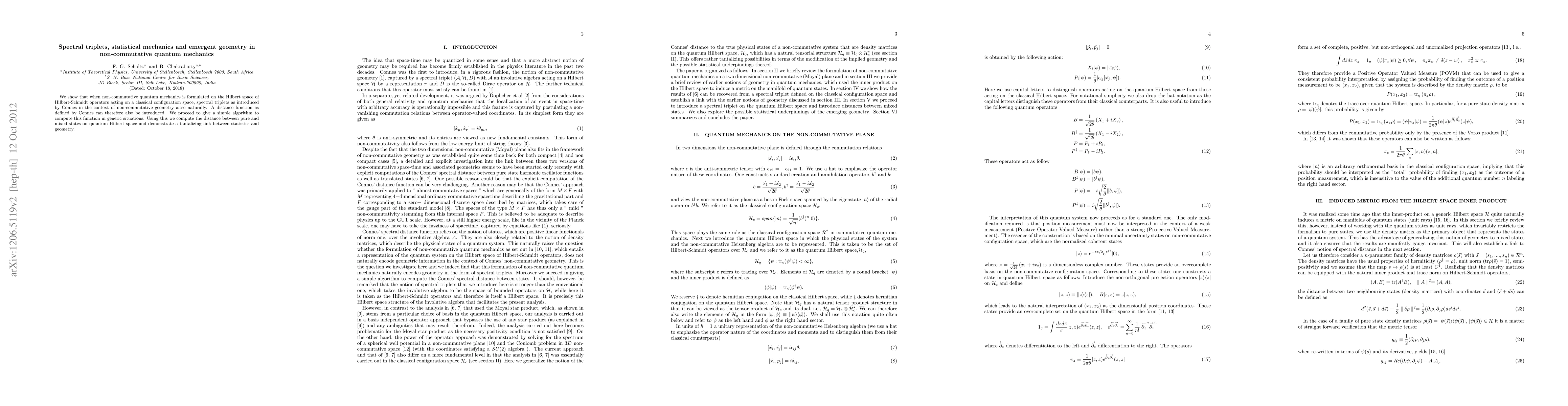 This paper demonstrates that spectral triplets from non-commutative geometry naturally emerge in non-commutative quantum mechanics on the quantum Hilbert space. It introduces a method to compute the Connes distance function and reveals a connection between statistical mechanics and emergent geometry.
