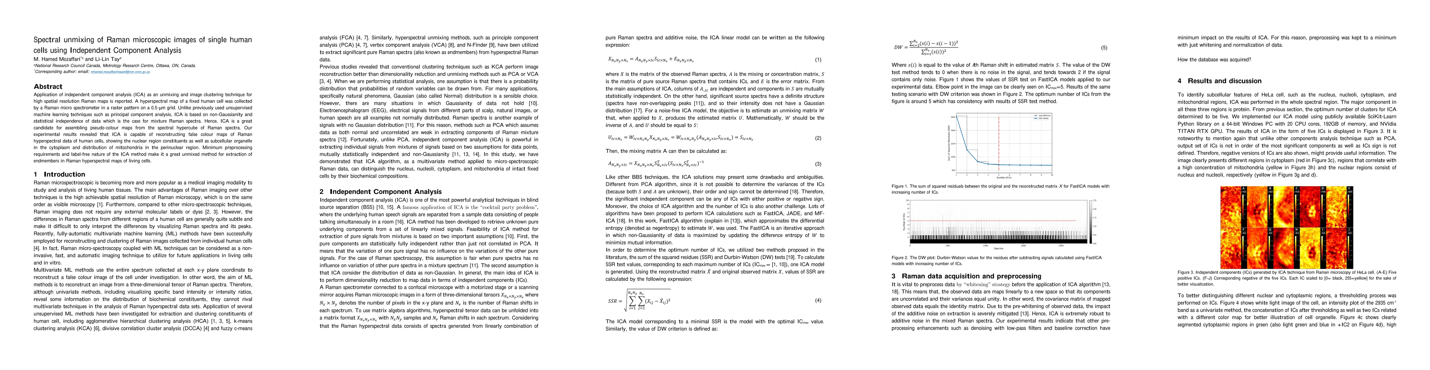 This paper applies independent component analysis (ICA) to unmix Raman microscopic images of single human cells, demonstrating its effectiveness in reconstructing pseudo-color maps that reveal nuclear constituents and subcellular organelles without requiring extensive preprocessing.