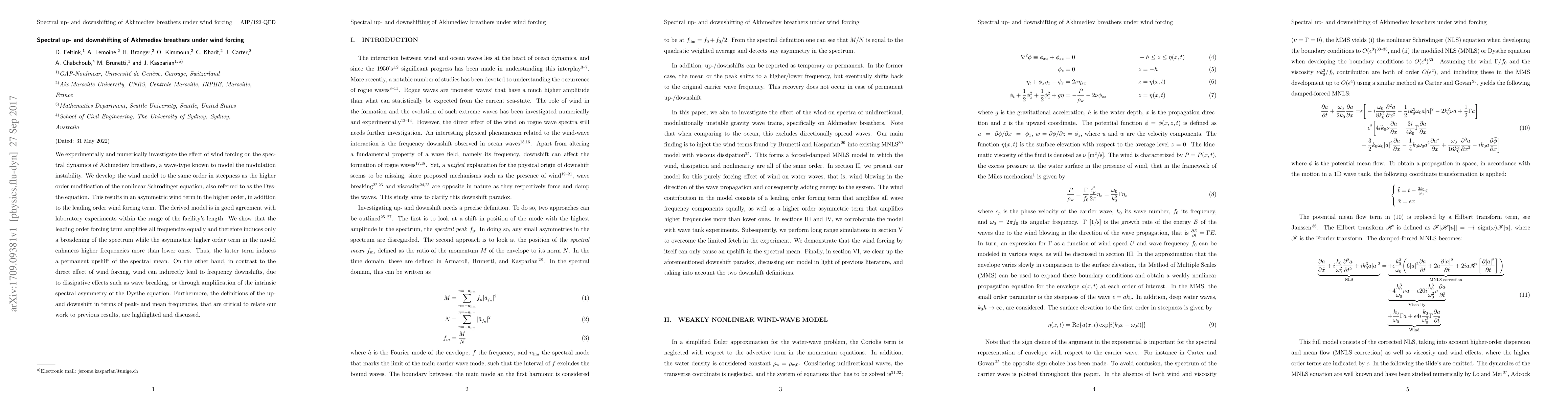 We experimentally and numerically investigate the effect of wind forcing on the spectral dynamics of Akhmediev breathers, a wave-type known to model the modulation instability. We develop the wind model to the same order in steepness as the higher order modifcation of the nonlinear Schroedinger equation, also referred to as the Dysthe equation. This results in an asymmetric wind term in the higher order, in addition to the leading order wind forcing term. The derived model is in good agreement with laboratory experiments within the range of the facility's length. We show that the leading order forcing term amplifies all frequencies equally and therefore induces only a broadening of the spectrum while the asymmetric higher order term in the model enhances higher frequencies more than lower ones. Thus, the latter term induces a permanent upshift of the spectral mean. On the other hand, in contrast to the direct effect of wind forcing, wind can indirectly lead to frequency downshifts, due to dissipative effects such as wave breaking, or through amplification of the intrinsic spectral asymmetry of the Dysthe equation. Furthermore, the definitions of the up- and downshift in terms of peak- and mean frequencies, that are critical to relate our work to previous results, are highlighted and discussed.