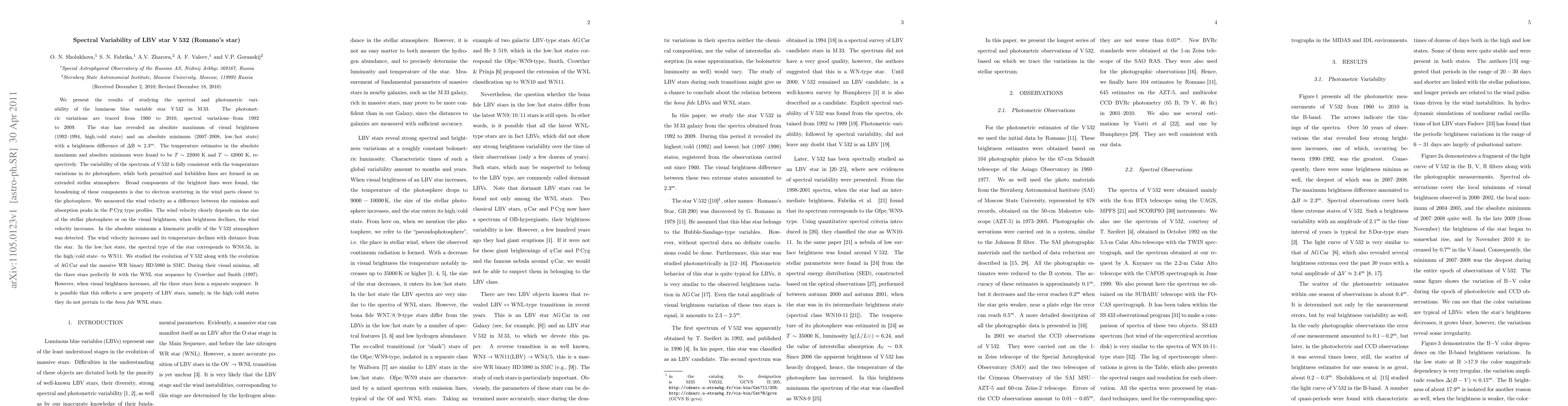 (abridged) We present the results of studying the spectral and photometric variability of the luminous blue variable star V532 in M33. The photometric variations are traced from 1960 to 2010, spectral variations - from 1992 to 2009. The star has revealed an absolute maximum of visual brightness (1992-1994, high/cold state) and an absolute minimum (2007-2008, low/hot state). The variability of the spectrum of V532 is fully consistent with the temperature variations in its photosphere, while both permitted and forbidden lines are formed in an extended stellar atmosphere. Broad components of the brightest lines were found, the broadening of these components is due to electron scattering in the wind parts closest to the photosphere. The wind velocity clearly depends on the size of the stellar photosphere or on the visual brightness, when brightness declines, the wind velocity increases. In the absolute minimum a kinematic profile of the V532 atmosphere was detected. The wind velocity increases and its temperature declines with distance from the star. In the low/hot state, the spectral type of the star corresponds to WN8.5h, in the high/cold state - to WN11. We studied the evolution of V532 along with the evolution of AG Car and the massive WR binary HD5980 in SMC. During their visual minima, all the three stars perfectly fit with the WNL star sequence by Crowther and Smith (1997). However, when visual brightness increases, all the three stars form a separate sequence. It is possible that this reflects a new property of LBV stars, namely, in the high/cold states they do not pertain to the bona fide WNL stars.