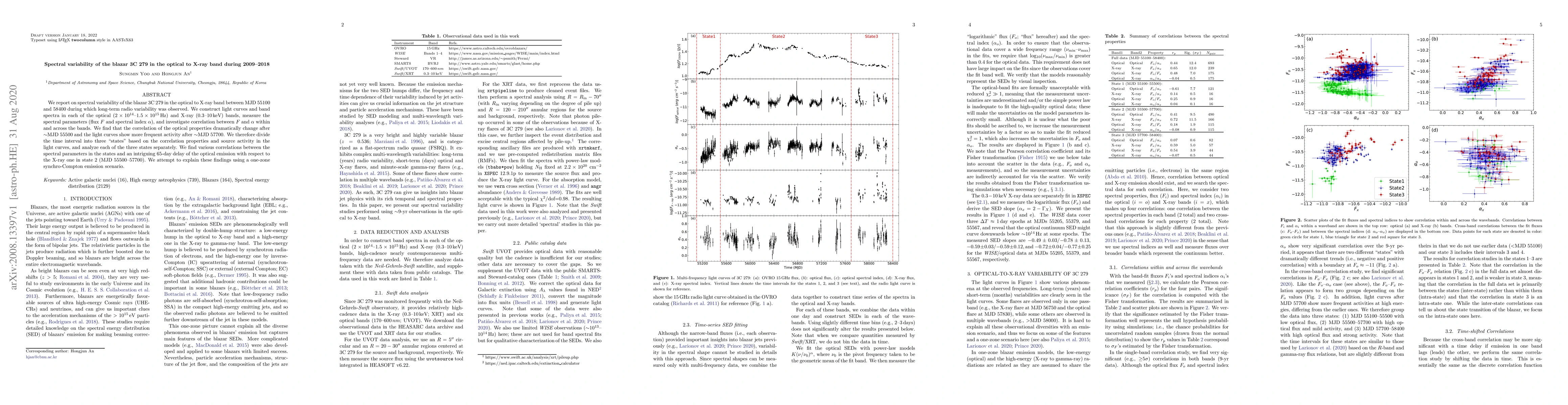 This paper investigates the spectral variability of the blazar 3C 279 from optical to X-ray bands over 2009-2018, identifying three distinct states based on changes in light curves and spectral correlations. The study finds a notable 65-day delay in optical emission relative to X-ray in the middle state, suggesting a one-zone synchro-Compton emission scenario.