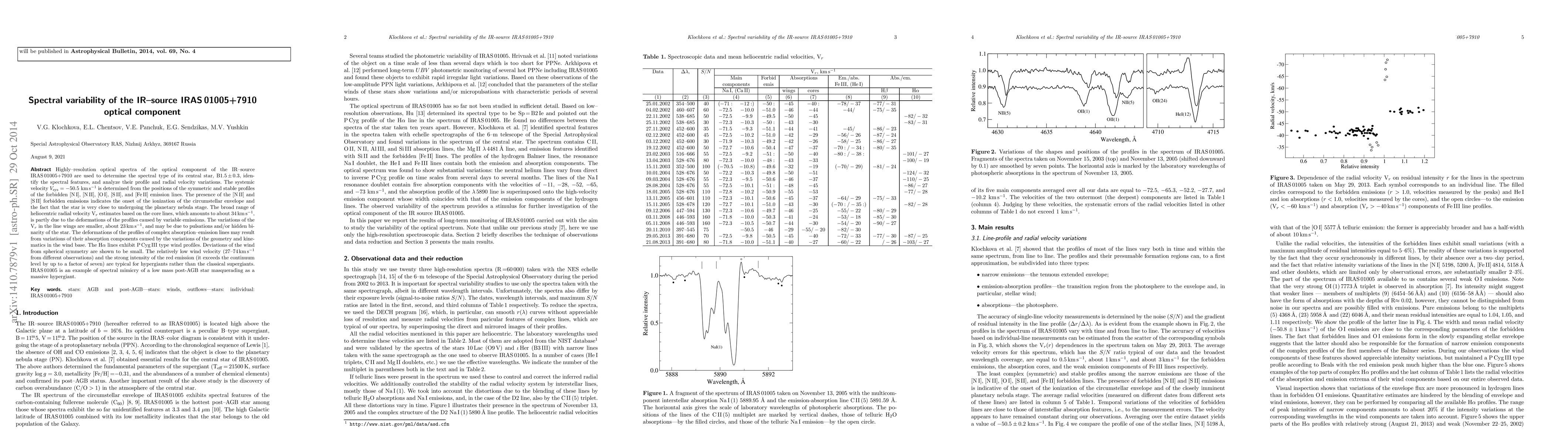 Highly-resolution optical spectra of the optical component of the IR-source IRAS01005+7910 are used to determine the spectral type of its central star, B1.5$ \pm $0.3, identify the spectral features, and analyze their profile and radial velocity variations. The systemic velocity Vsys =$-50.5$ km/s is determined from the positions of the symmetric and stable profiles of the forbidden [NI], [NII], [OI], [SII], and [FeII] emission lines. The presence of the [NII] and [SII] forbidden emissions indicates the onset of the ionization of the circumstellar envelope and the fact that the star is very close to undergoing the planetary nebula stage. The broad range of heliocentric radial velocity Vr estimates based on the core lines, which amounts to about 34 km/s, is partly due to the deformations of the profiles caused by variable emissions. The variations of the Vr in the line wings are smaller, about 23 km/s, and may be due to pulsations and/or hidden binarity of the star. The deformations of the profiles of complex absorption-emission lines may result from variations of their absorption components caused by the variations of the geometry and kinematics in the wind base. The H$\alpha$ lines exhibit P Cyg III type wind profiles. Deviations of the wind from spherical symmetry are shown to be small. The relatively low wind velocity (27$\div$74 km/s from different observations) and the strong intensity of the red emission (it exceeds the continuum level by up to a factor of seven) are typical for hypergiants rather than the classical supergiants. IRAS01005 +7910 is an example of spectral mimicry of a low mass post-AGB star masquerading as a massive hypergiant.
