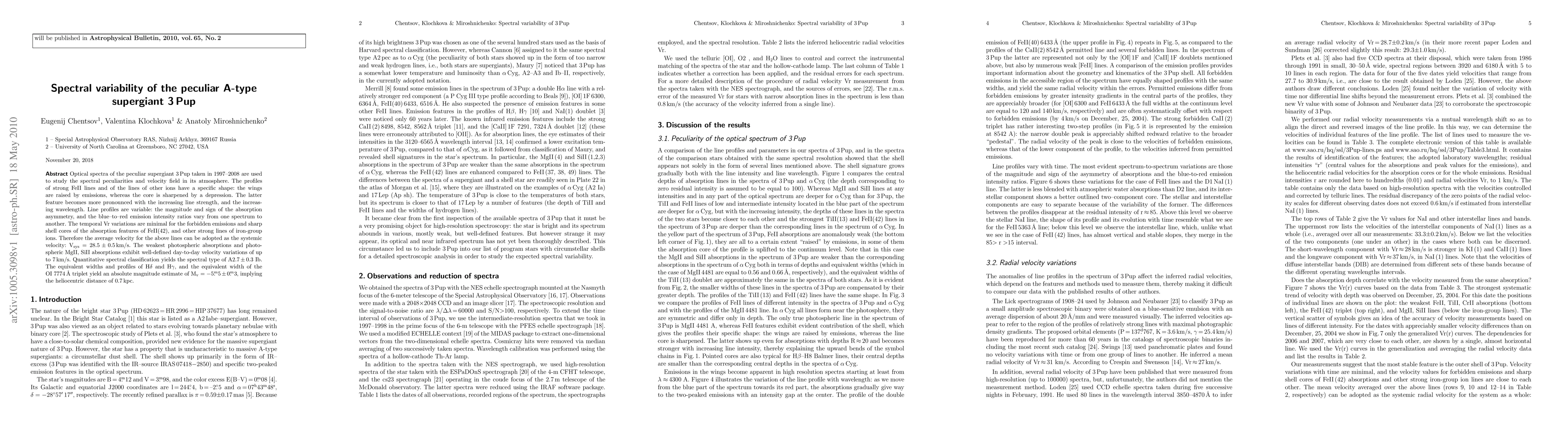 Optical spectra of the peculiar supergiant 3Pup taken in 1997-2008 are used to analyze the spectral peculiarities and velocity field in its atmosphere. The profiles of strong FeII lines and of the lines of other iron-group ions have a specific shape: the wings are raised by emissions, whereas the core is sharpened by a depression. The latter feature becomes more pronounced with the increasing line strength, and the increasing wavelength. Line profiles are variable: the magnitude and sign of the absorption asymmetry, and the blue-to-red emission intensity ratios vary from one spectrum to another. The temporal Vr variations are minimal for the forbidden emissions and sharp shell cores of the absorption features of FeII(42), and other strong lines of iron-group ions. The average velocity for the above lines can be adopted as the systemic velocity: Vsys=28.5+/-0.5km/s. The weakest photospheric absorptions and photospheric MgII, SiII absorptions exhibit well-defined day-to-day velocity variations of up to 7km/s. Quantitative spectral classification yields the spectral type of A2.7+/-0.3 Ib. The equivalent widths and profiles of Hdelta and Hgamma, and the equivalent width of the OI7774A triplet yield an absolute magnitude estimate of Mv=-5.5+/-0.3mag, implying the heliocentric distance of 0.7kpc.