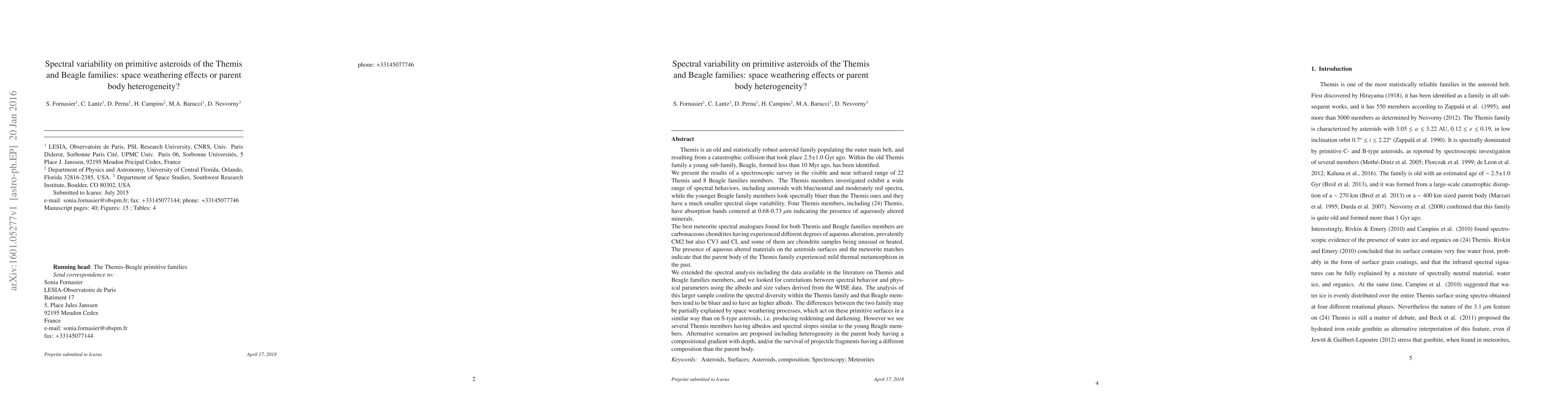 This study investigates spectral variability among members of the Themis and Beagle asteroid families, suggesting that space weathering may not fully explain the observed differences. The analysis indicates that heterogeneity in the parent body's composition or the survival of distinct projectile fragments could also contribute to the spectral diversity.