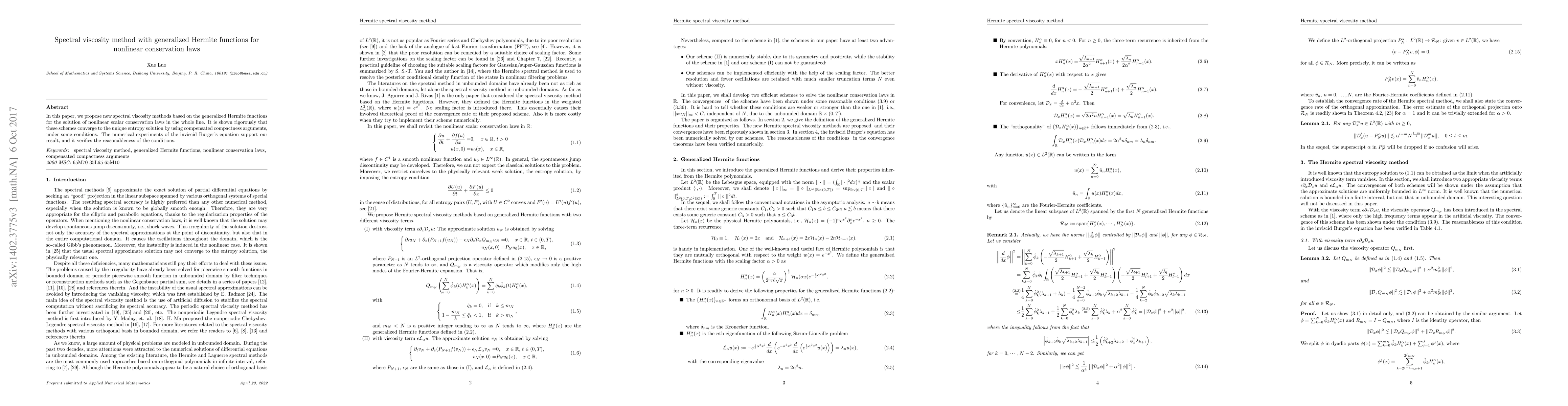 This paper introduces a new spectral viscosity method using generalized Hermite functions for solving nonlinear conservation laws. The proposed method is rigorously shown to converge to the unique entropy solution, supported by numerical experiments on the inviscid Burger's equation.