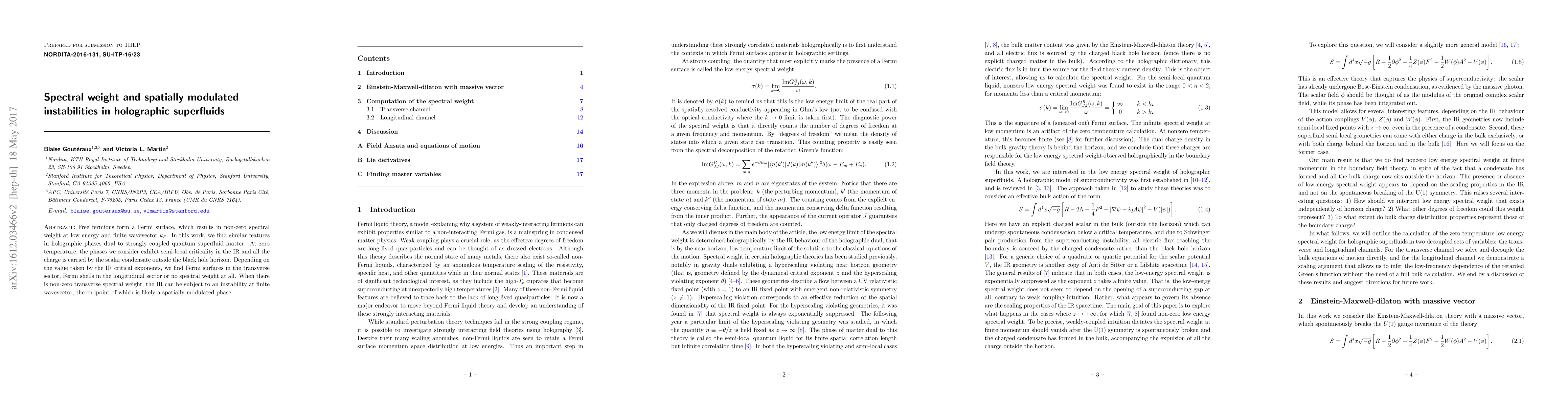 Researchers found similar spectral weight features in holographic superfluids as in Fermi surfaces of free fermions, with varying patterns of spectral weight depending on the IR critical exponents, leading to potential spatially modulated phases.