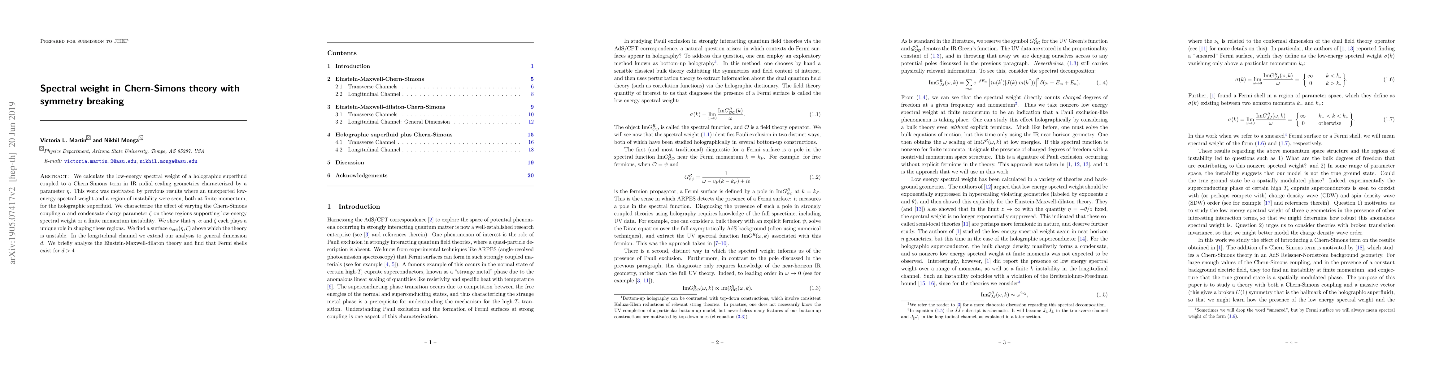 We calculate the low-energy spectral weight of a holographic superfluid coupled to a Chern-Simons term in IR radial scaling geometries characterized by a parameter $\eta$. This work was motivated by previous results where an unexpected low-energy spectral weight and a region of instability were seen, both at finite momentum, for the holographic superfluid. We characterize the effect of varying the Chern-Simons coupling $\alpha$ and condensate charge parameter $\zeta$ on these regions supporting low-energy spectral weight or a finite momentum instability. We show that $\eta$, $\alpha$ and $\zeta$ each plays a unique role in shaping these regions. We find a surface $\alpha_{\text{crit}}(\eta, \zeta)$ above which the theory is unstable. In the longitudinal channel we extend our analysis to general dimension $d$. We briefly analyze the Einstein-Maxwell-dilaton theory and find that Fermi shells exist for $d>4$.
