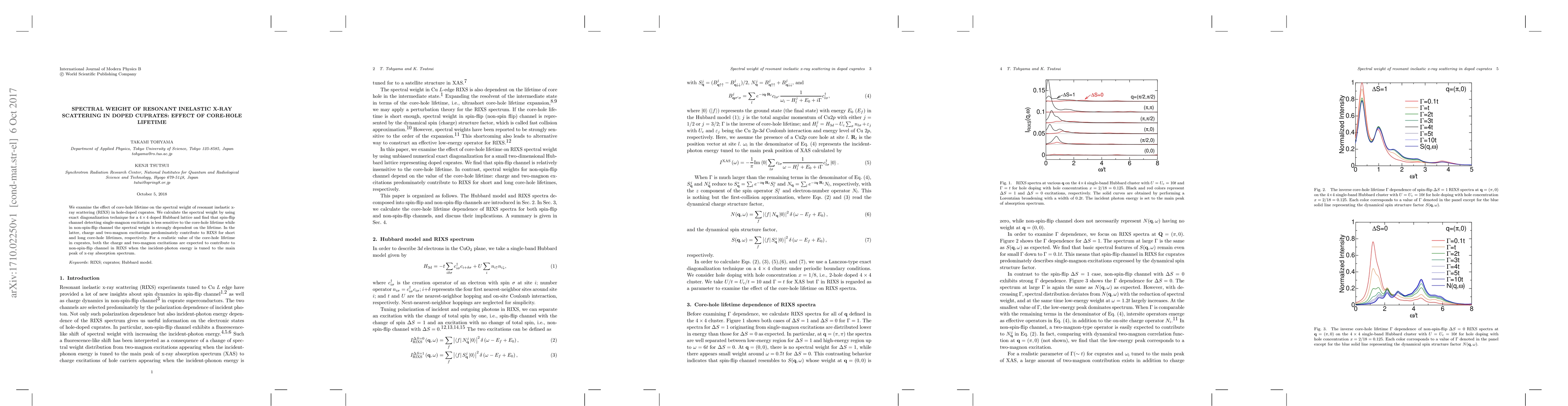 We examine the effect of core-hole lifetime on the spectral weight of resonant inelastic x-ray scattering (RIXS) in hole-doped cuprates. We calculate the spectral weight by using exact diagonalization technique for a 4x4 doped Hubbard lattice and find that spin-flip channel detecting single-magnon excitation is less sensitive to the core-hole lifetime while in non-spin-flip channel the spectral weight is strongly dependent on the lifetime. In the latter, charge and two-magnon excitations predominately contribute to RIXS for short and long core-hole lifetimes, respectively. For a realistic value of the core-hole lifetime in cuprates, both the charge and two-magnon excitations are expected to contribute to non-spin-flip channel in RIXS when the incident-photon energy is tuned to the main peak of x-ray absorption spectrum.