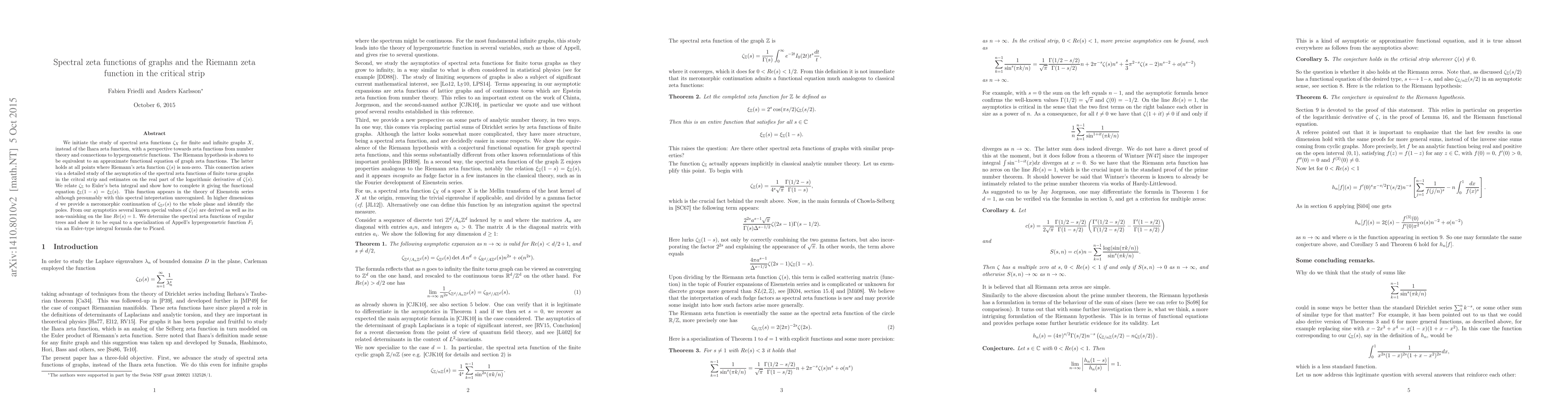 This paper explores spectral zeta functions for graphs, establishing connections to number theory and hypergeometric functions. It demonstrates the equivalence of the Riemann hypothesis to an approximate functional equation of graph zeta functions, revealing deep links between graph theory and the critical strip of the Riemann zeta function.