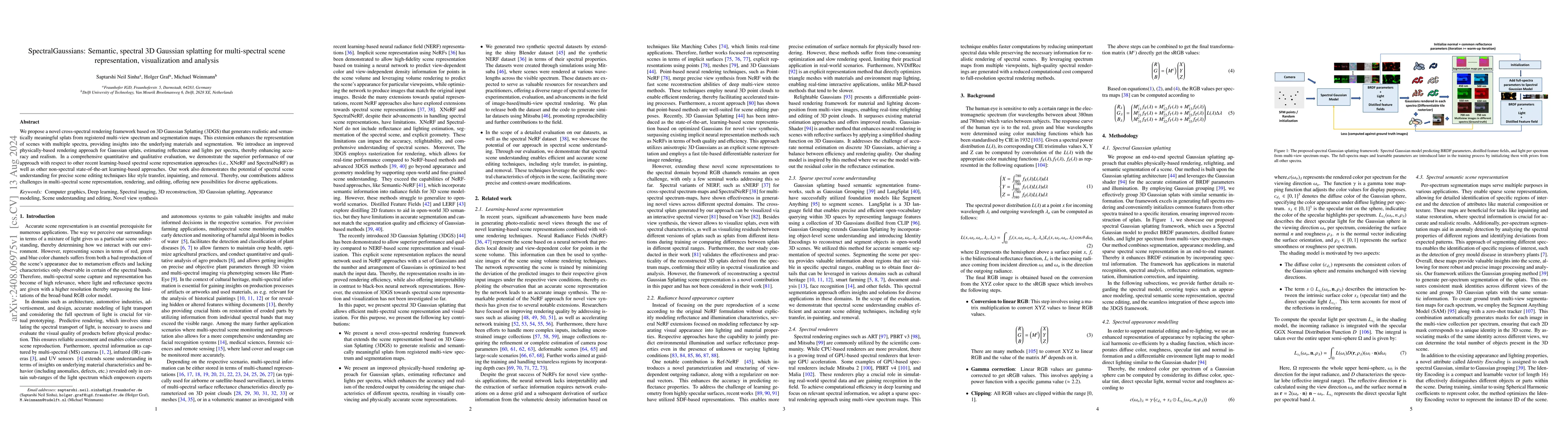 SpectralGaussians proposes a cross-spectral rendering framework using 3D Gaussian Splatting to represent and visualize multi-spectral scenes. The approach enhances realism and material insight through improved physically-based rendering, outperforming existing spectral and non-spectral rendering methods in evaluation.
