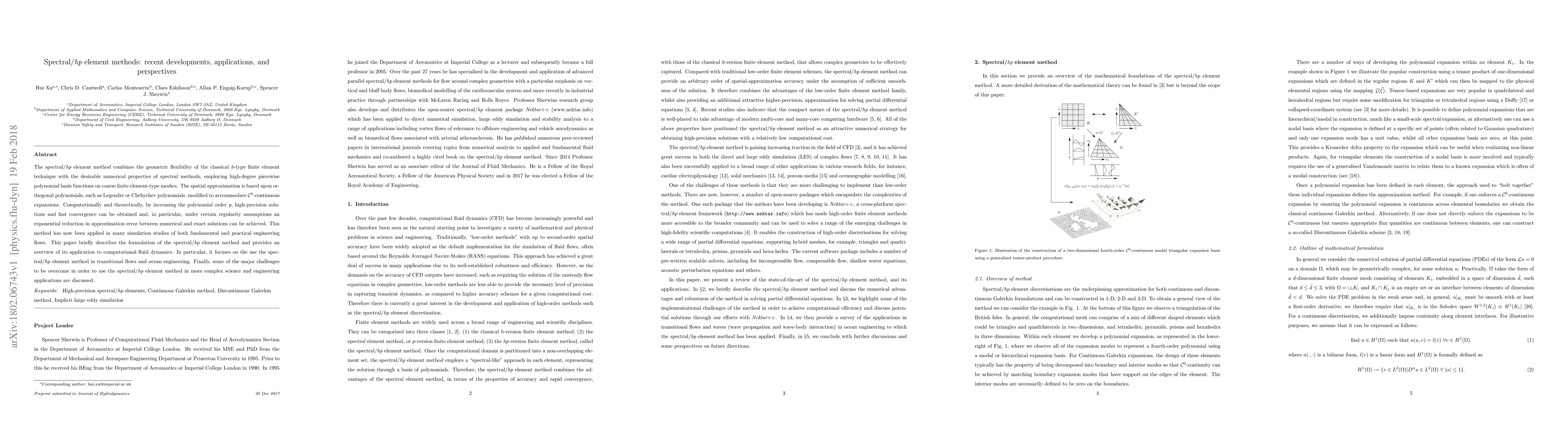 The spectral/hp element method integrates the benefits of h-type finite element methods with spectral techniques, achieving high-precision solutions and rapid convergence through high-degree polynomial basis functions. Its application in computational fluid dynamics, particularly for transitional flows and ocean engineering, is highlighted, along with challenges for broader use.