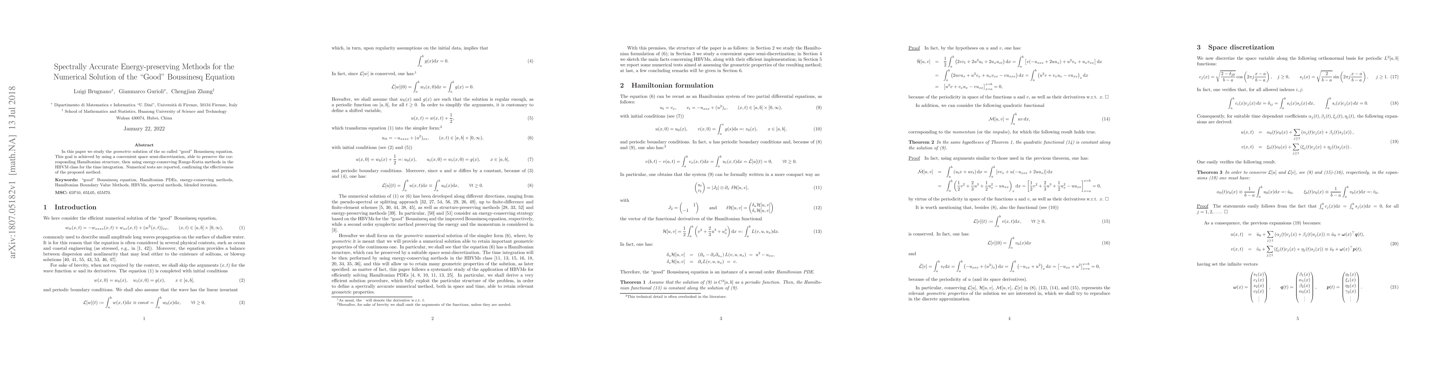 In this paper we study the geometric solution of the so called "good" Boussinesq equation. This goal is achieved by using a convenient space semi-discretization, able to preserve the corresponding Hamiltonian structure, then using energy-conserving Runge-Kutta methods in the HBVM class for the time integration. Numerical tests are reported, confirming the effectiveness of the proposed method.