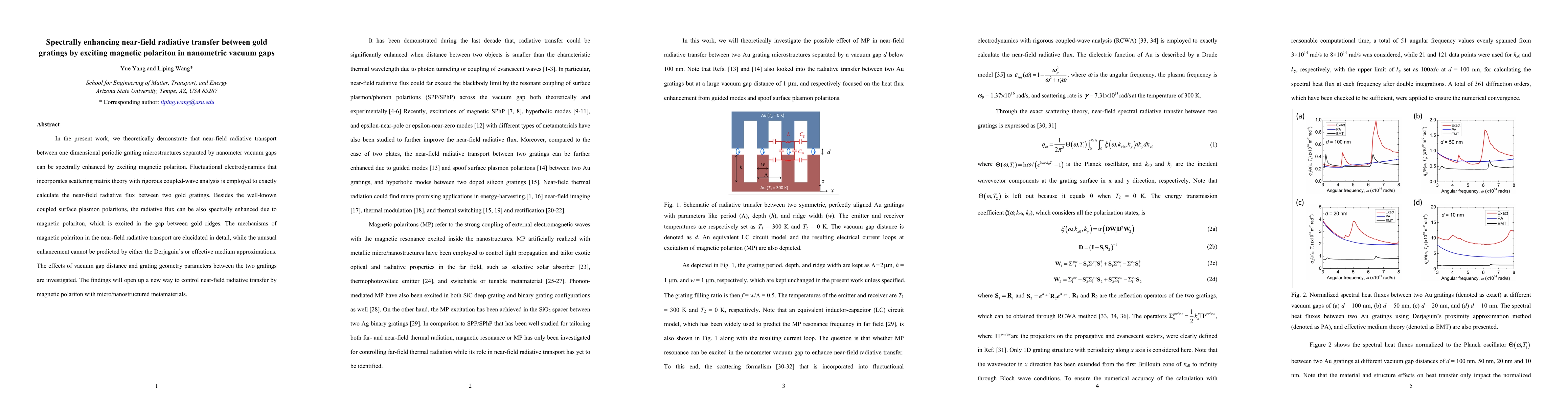 This paper theoretically demonstrates spectrally enhanced near-field radiative transport between gold gratings by exciting magnetic polariton in nanometric vacuum gaps, using fluctuational electrodynamics and rigorous coupled wave analysis. The study reveals that magnetic polariton can significantly enhance radiative flux, offering a new method to control near-field radiative transfer via micro or nanostructured metamaterials.