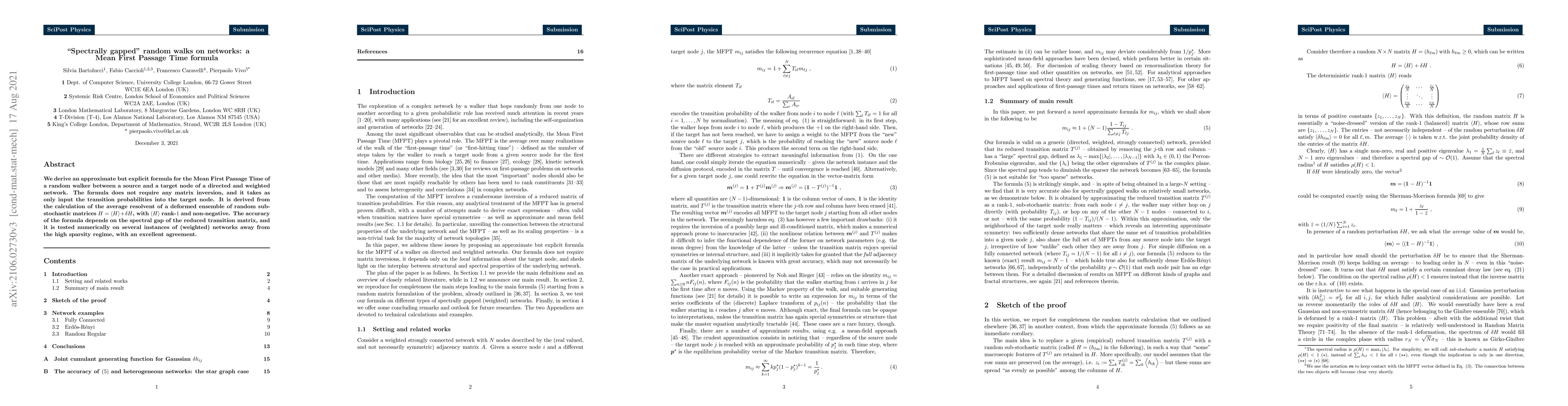 This paper presents an explicit formula for the Mean First Passage Time of random walks on directed and weighted networks, derived from the average resolvent of a deformed ensemble of random sub-stochastic matrices. The formula is computationally efficient as it avoids matrix inversion and is shown to be accurate for networks with a spectral gap.
