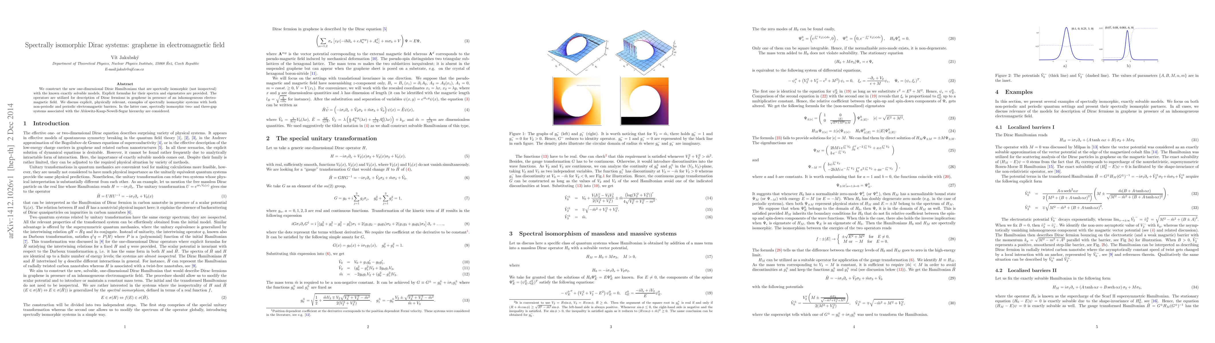 This paper constructs new one-dimensional Dirac Hamiltonians that are spectrally isomorphic to known models, providing explicit formulas for their spectra and eigenstates. These operators describe Dirac fermions in graphene under an inhomogeneous electromagnetic field, with examples of both non-periodic and periodic electromagnetic barriers discussed.