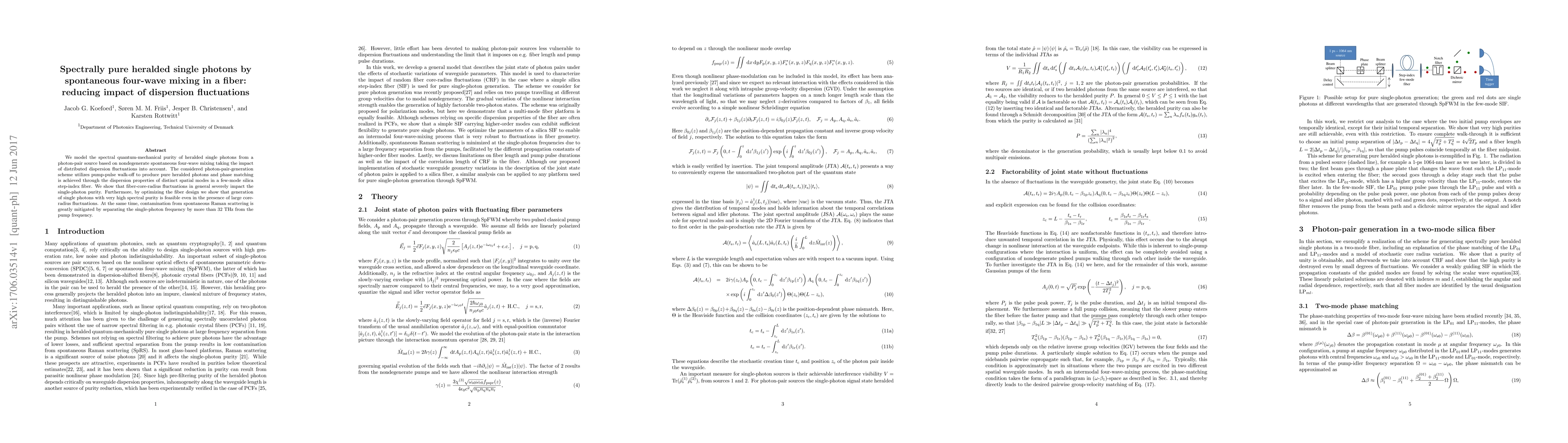 We model the spectral quantum-mechanical purity of heralded single photons from a photon-pair source based on nondegenerate spontaneous four-wave mixing taking the impact of distributed dispersion fluctuations into account. The considered photon-pair-generation scheme utilizes pump-pulse walk-off to produce pure heralded photons and phase matching is achieved through the dispersion properties of distinct spatial modes in a few-mode silica step-index fiber. We show that fiber-core-radius fluctuations in general severely impact the single-photon purity. Furthermore, by optimizing the fiber design we show that generation of single photons with very high spectral purity is feasible even in the presence of large core-radius fluctuations. At the same time, contamination from spontaneous Raman scattering is greatly mitigated by separating the single-photon frequency by more than 32 THz from the pump frequency.