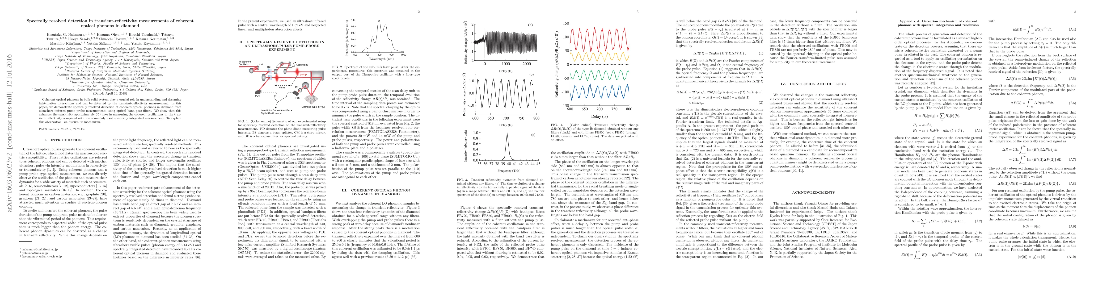 This paper demonstrates spectrally resolved detection of coherent optical phonons in diamond using ultrashort infrared pump-probe measurements with optical band-pass filters, enhancing sensitivity by 35 times compared to spectrally integrated methods. The improved sensitivity aids in better understanding light-matter interactions in solid systems.