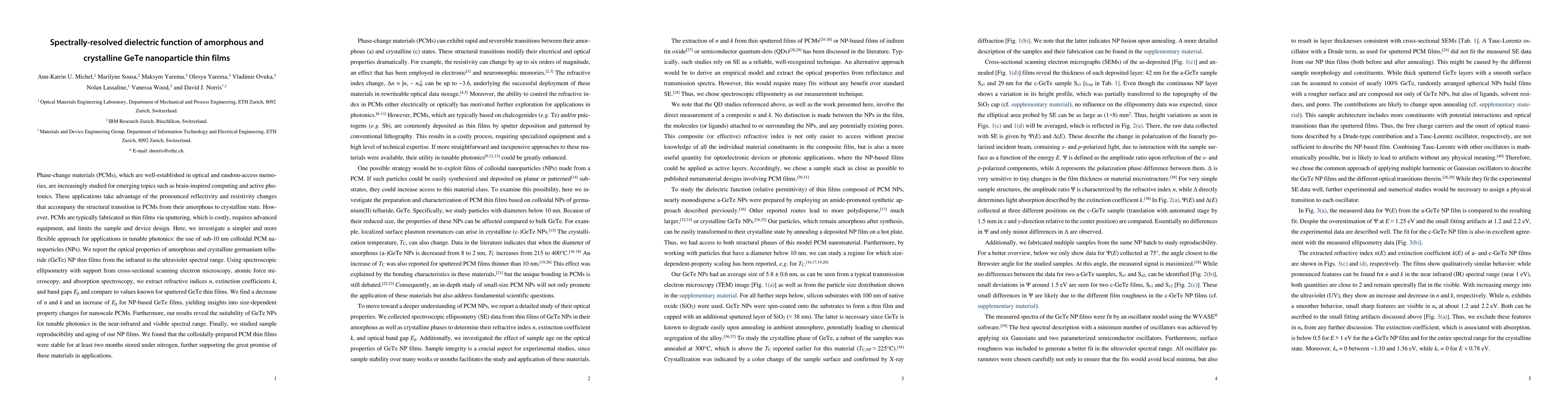 This paper investigates the spectrally-resolved optical properties of amorphous and crystalline germanium telluride (GeTe) nanoparticle thin films, revealing size-dependent changes in refractive indices, extinction coefficients, and band gaps. The study suggests these nanoparticles are suitable for tunable photonics applications in the near-infrared and visible range, with stable performance over time.