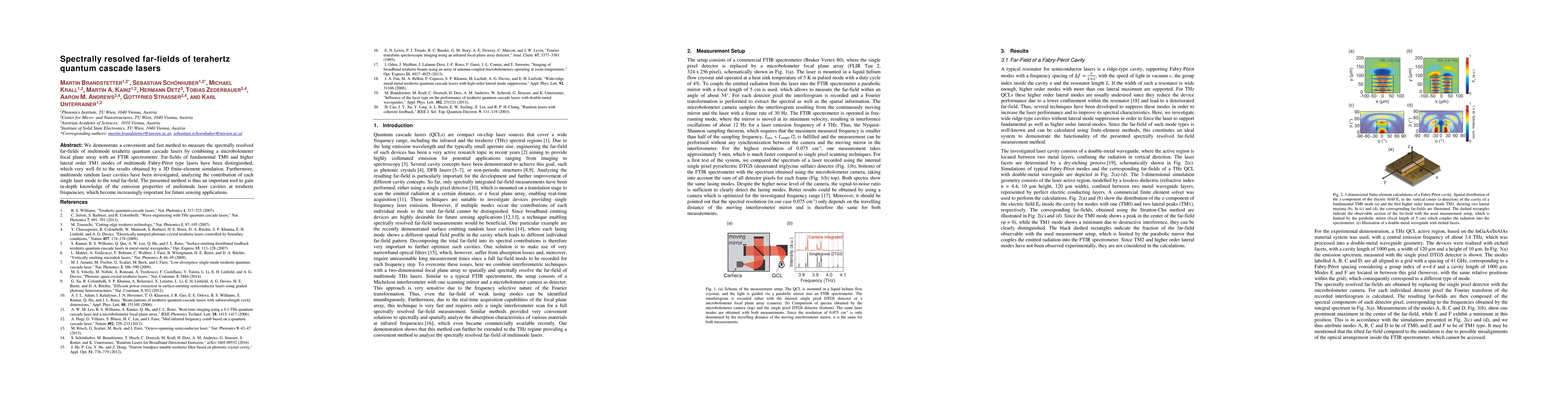 This paper presents a novel method combining microbolometer arrays and FTIR spectrometers to measure spectrally resolved far-fields of multimode terahertz quantum cascade lasers, distinguishing fundamental and higher-order modes and validating results with 3D simulations. The method provides valuable insights into the emission properties of terahertz laser cavities for future sensing applications.