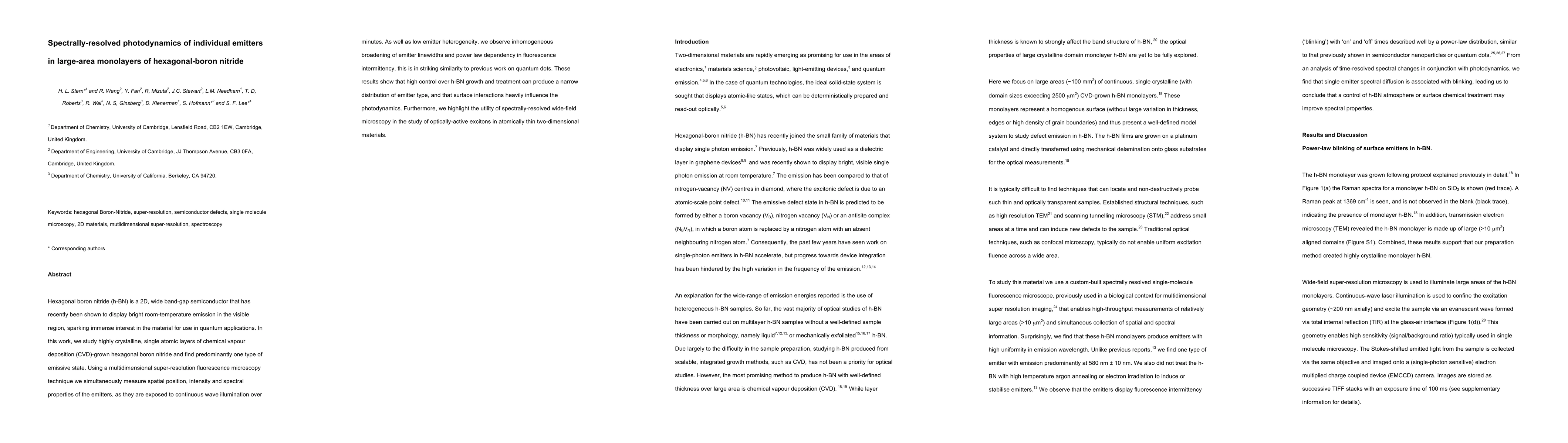 Hexagonal boron nitride (h-BN) is a 2D, wide band-gap semiconductor that has recently been shown to display bright room-temperature emission in the visible region, sparking immense interest in the material for use in quantum applications. In this work, we study highly crystalline, single atomic layers of chemical vapour deposition (CVD)-grown hexagonal boron nitride and find predominantly one type of emissive state. Using a multidimensional super-resolution fluorescence microscopy technique we simultaneously measure spatial position, intensity and spectral properties of the emitters, as they are exposed to continuous wave illumination over minutes. As well as low emitter heterogeneity, we observe inhomogeneous broadening of emitter line-widths and power law dependency in fluorescence intermittency, this is in striking similarity to previous work on quantum dots. These results show that high control over h-BN growth and treatment can produce a narrow distribution of emitter type, and that surface interactions heavily influence the photodynamics. Furthermore, we highlight the utility of spectrally-resolved wide-field microscopy in the study of optically-active excitons in atomically thin two-dimensional materials.