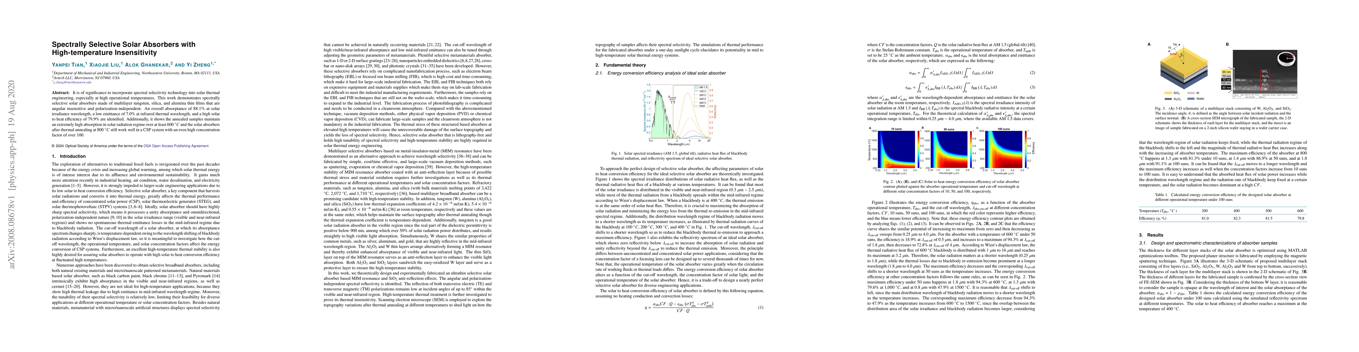 Researchers developed spectrally selective solar absorbers that maintain high absorption efficiency at high temperatures, with an overall absorptance of 88.1% and a high concentration factor of over 100.