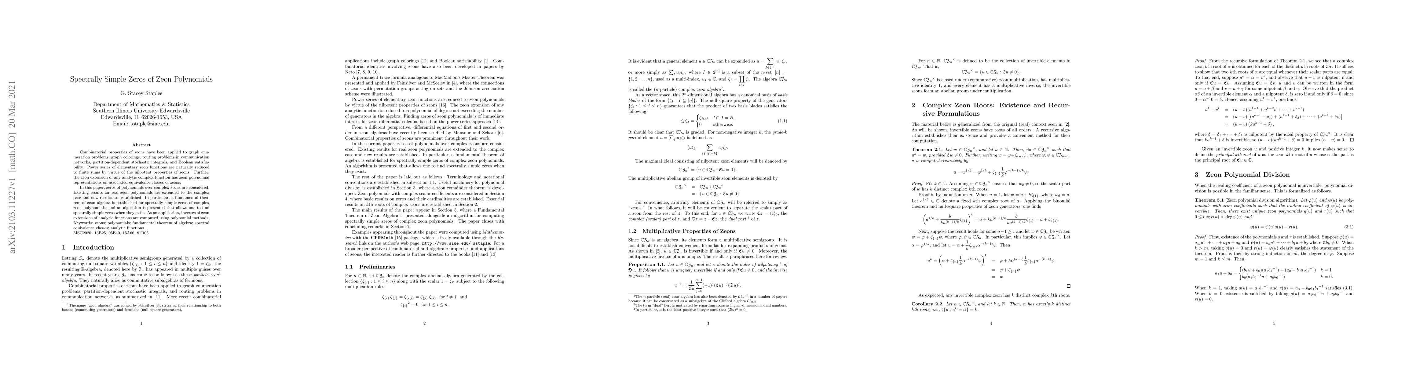 Combinatorial properties of zeons have been applied to graph enumeration problems, graph colorings, routing problems in communication networks, partition-dependent stochastic integrals, and Boolean satisfiability. Power series of elementary zeon functions are naturally reduced to finite sums by virtue of the nilpotent properties of zeons. Further, the zeon extension of any analytic complex function has zeon polynomial representations on associated equivalence classes of zeons. In this paper, zeros of polynomials over complex zeons are considered. Existing results for real zeon polynomials are extended to the complex case and new results are established. In particular, a fundamental theorem of zeon algebra is established for spectrally simple zeros of complex zeon polynomials, and an algorithm is presented that allows one to find spectrally simple zeros when they exist. As an application, inverses of zeon extensions of analytic functions are computed using polynomial methods.