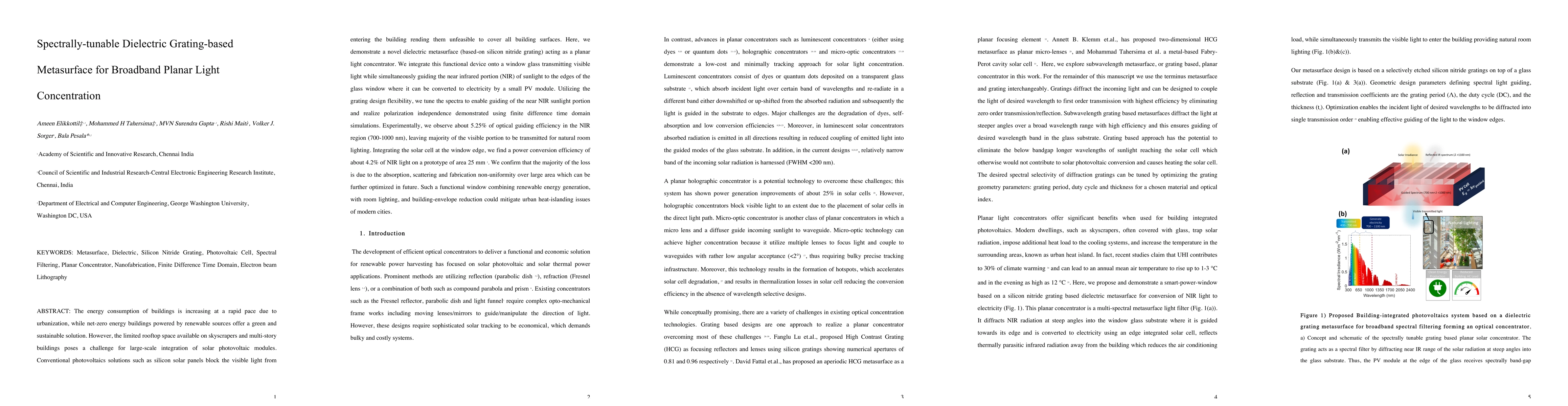 The energy consumption of buildings is increasing at a rapid pace due to urbanization, while net-zero energy buildings powered by renewable sources offer a green and sustainable solution. However, the limited rooftop space available on skyscrapers and multi-story buildings poses a challenge for large-scale integration of solar photovoltaic modules. Conventional photovoltaics solutions such as silicon solar panels block the visible light from entering the building rending them unfeasible to cover all building surfaces. Here, we demonstrate a novel dielectric metasurface (based-on silicon nitride grating) acting as a planar light concentrator. We integrate this functional device onto a window glass transmitting visible light while simultaneously guiding the near infrared portion (NIR) of sunlight to the edges of the glass window where it can be converted to electricity by a small PV module. Utilizing the grating design flexibility, we tune the spectra to enable guiding of the near NIR sunlight portion and realize polarization independence demonstrated using finite difference time domain simulations. Experimentally, we observe about 5.25% of optical guiding efficiency in the NIR region (700-1000 nm), leaving majority of the visible portion to be transmitted for natural room lighting. Integrating the solar cell at the window edge, we find a power conversion efficiency of about 4.2% of NIR light on a prototype of area 25 mm 2. We confirm that the majority of the loss is due to the absorption, scattering and fabrication non-uniformity over large area which can be further optimized in future. Such a functional window combining renewable energy generation, with room lighting, and building-envelope reduction could mitigate urban heat-islanding issues of modern cities.