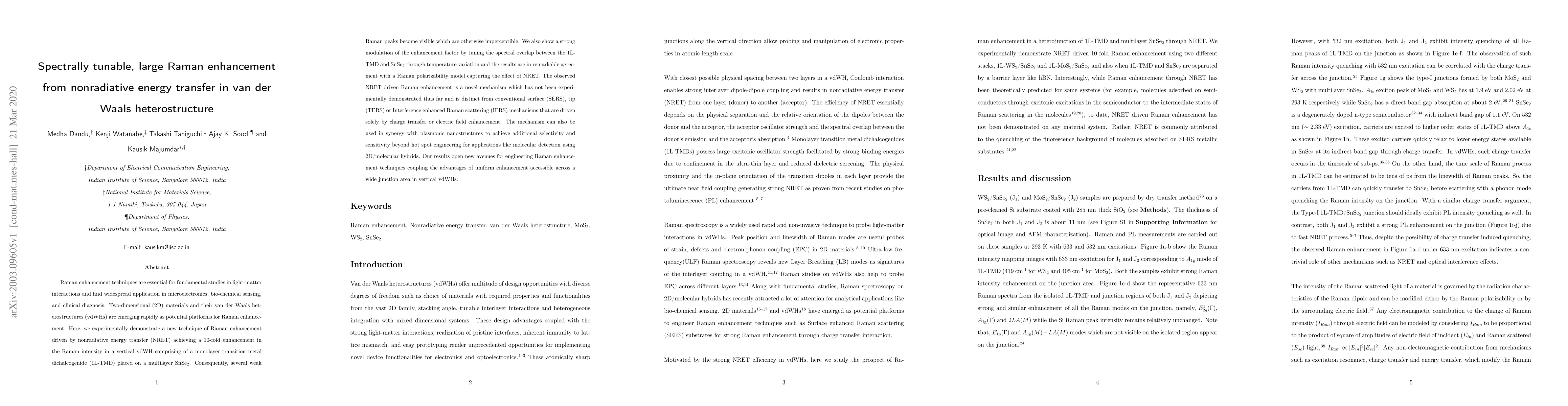 This paper demonstrates a novel technique of Raman enhancement via nonradiative energy transfer (NRET) in van der Waals heterostructures, achieving a 10-fold intensity increase in Raman signals. The method, distinct from conventional SERS or TERS, shows strong modulation through spectral tuning and holds promise for applications in molecular detection and bio-chemical sensing.