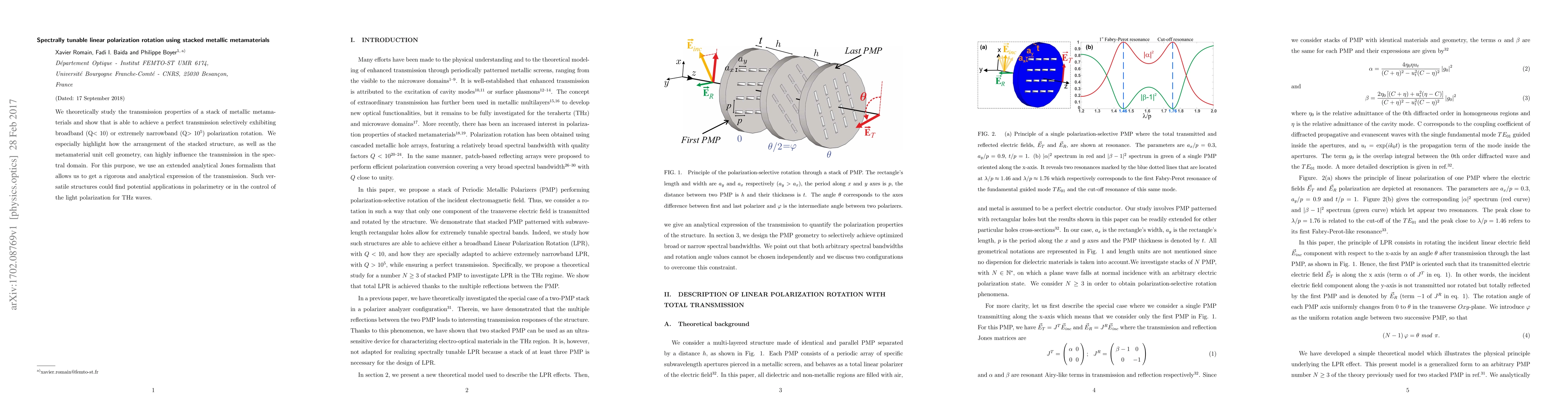 We theoretically study the transmission properties of a stack of metallic metamaterials and show that is able to achieve a perfect transmission selectively exhibiting broadband ($Q<10$) or extremely narrowband ($Q>10^5$) polarization rotation. We especially highlight how the arrangement of the stacked structure, as well as the metamaterial unit cell geometry, can highly influence the transmission in the spectral domain. For this purpose, we use an extended analytical Jones formalism that allows us to get a rigorous and analytical expression of the transmission. Such versatile structures could find potential applications in polarimetry or in the control of the light polarization for THz waves.