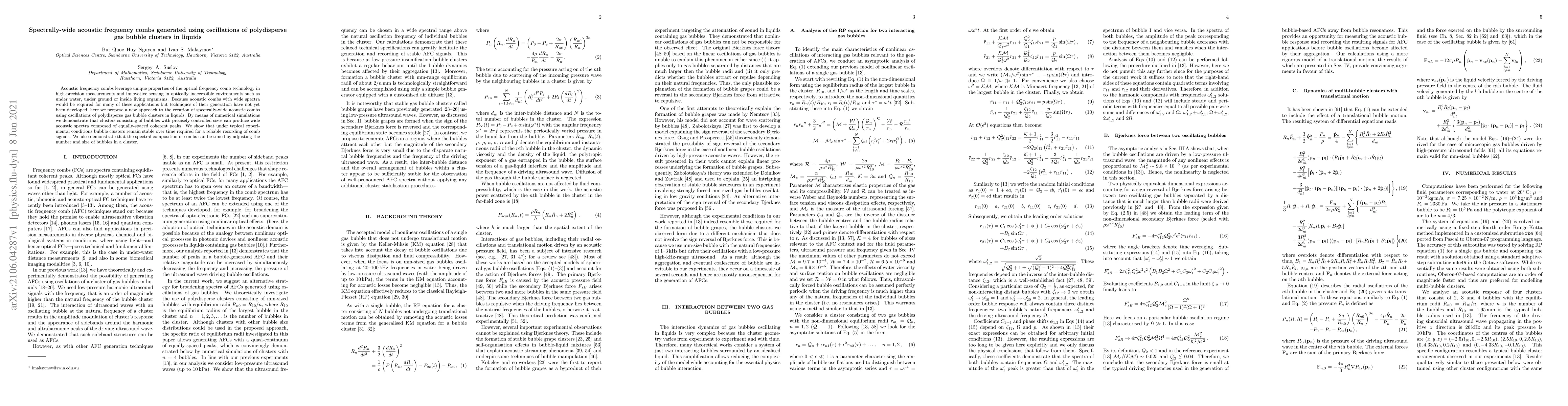 This paper proposes a novel method for generating spectrally-wide acoustic frequency combs using oscillations of polydisperse gas bubble clusters in liquids. Numerical simulations show that these clusters can produce wide, stable acoustic spectra with tunable spectral composition by adjusting bubble size and number.