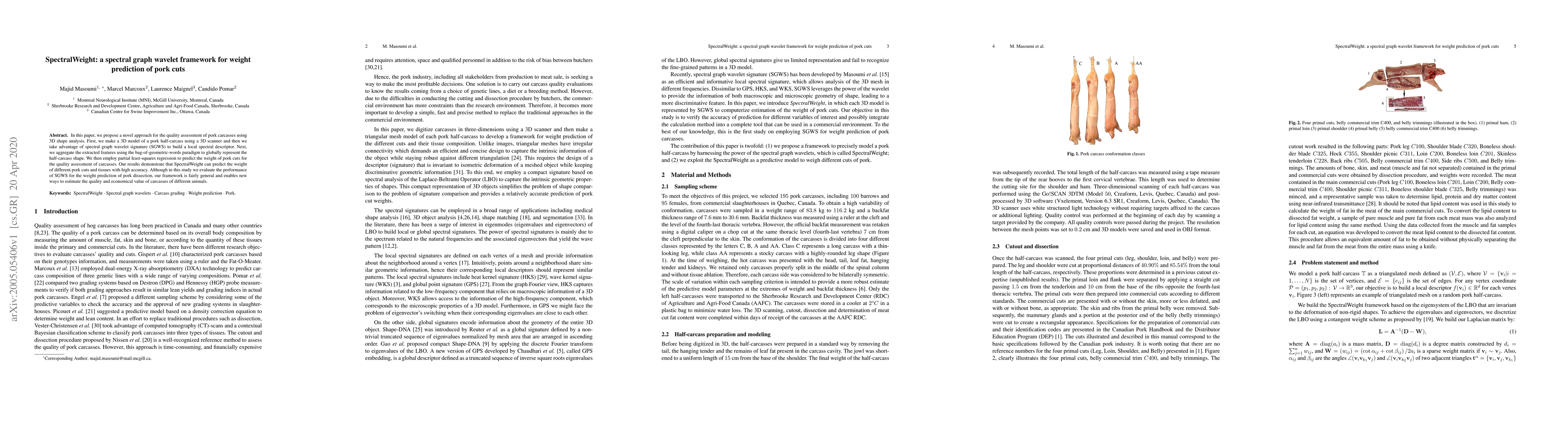 In this paper, we propose a novel approach for the quality assessment of pork carcasses using 3D shape analysis. First, we make a 3D model of a pork half-carcass using a 3D scanner and then we take advantage of spectral graph wavelet signature (SGWS) to build a local spectral descriptor. Next, we aggregate the extracted features using the bag-of-geometric-words paradigm to globally represent the half-carcass shape. We then employ partial least-squares regression to predict the weight of pork cuts for the quality assessment of carcasses. Our results demonstrate that SpectralWeight can predict the weight of different pork cuts and tissues with high accuracy. Although in this study we evaluate the performance of SGWS for the weight prediction of pork dissection, our framework is fairly general and enables new ways to estimate the quality and economical value of carcasses of different animals.