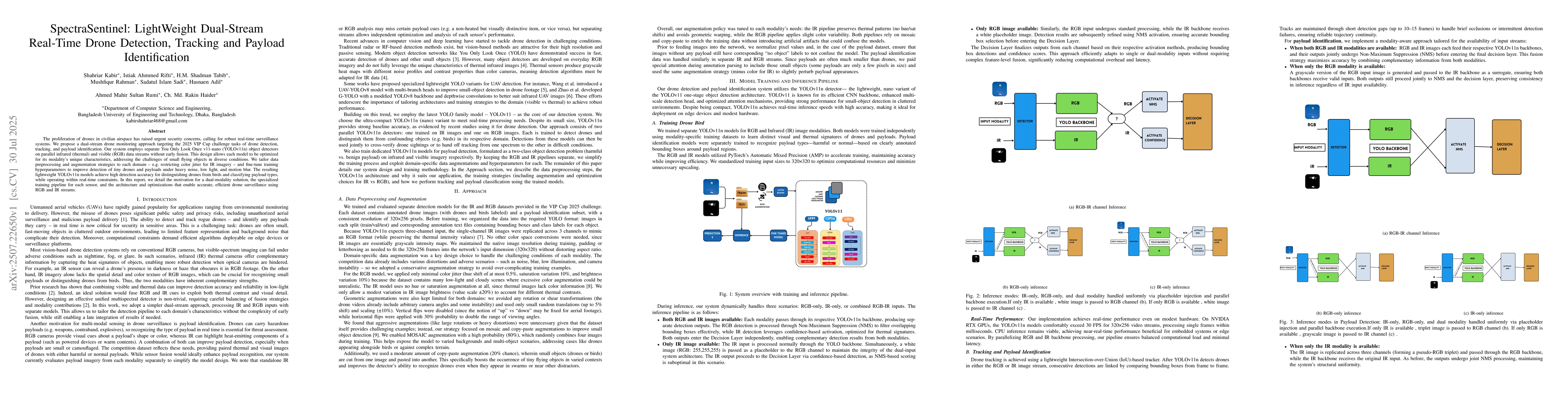 The research proposes SpectraSentinel, a lightweight dual-stream real-time drone detection, tracking, and payload identification system using RGB and infrared (IR) modalities. It employs independent YOLOv11n object detectors on parallel IR and RGB data streams, optimizing each model for its respective modality's characteristics, and addresses challenges posed by small aerial objects in diverse conditions.