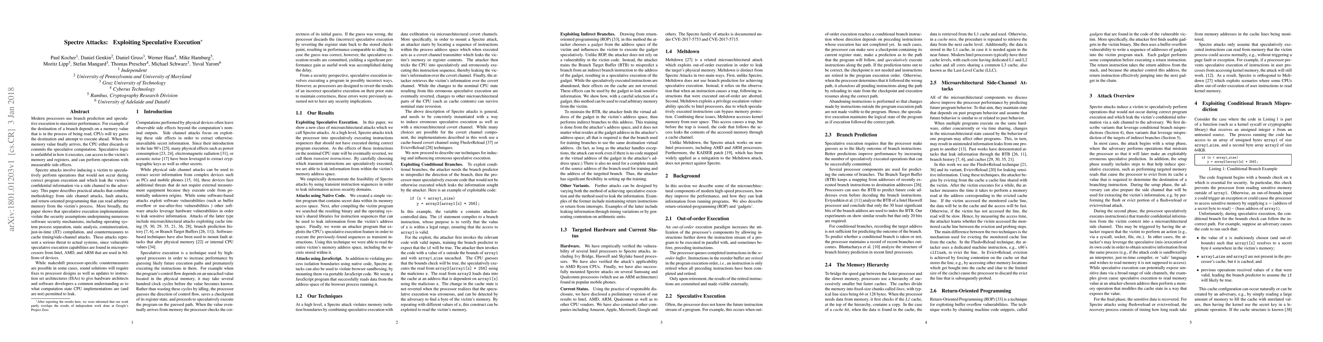 Spectre attacks exploit speculative execution in modern processors to leak confidential information by inducing speculative operations that reveal side-channel data. These attacks pose a significant threat to various software security mechanisms and are prevalent across major microprocessor architectures.