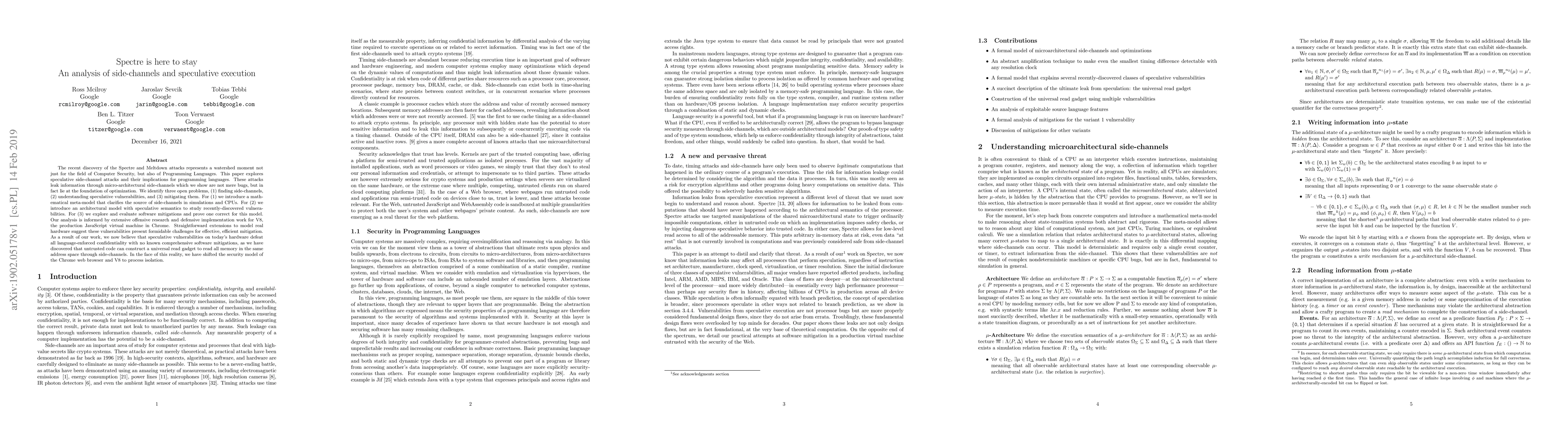 This paper investigates the Spectre and Meltdown attacks, revealing that speculative side-channel attacks fundamentally challenge programming languages by exploiting optimization techniques. The authors propose mathematical and architectural models to understand and mitigate these vulnerabilities, but conclude that current mitigations are insufficient, leading to a shift in the security model of Chrome and V8 to process isolation.