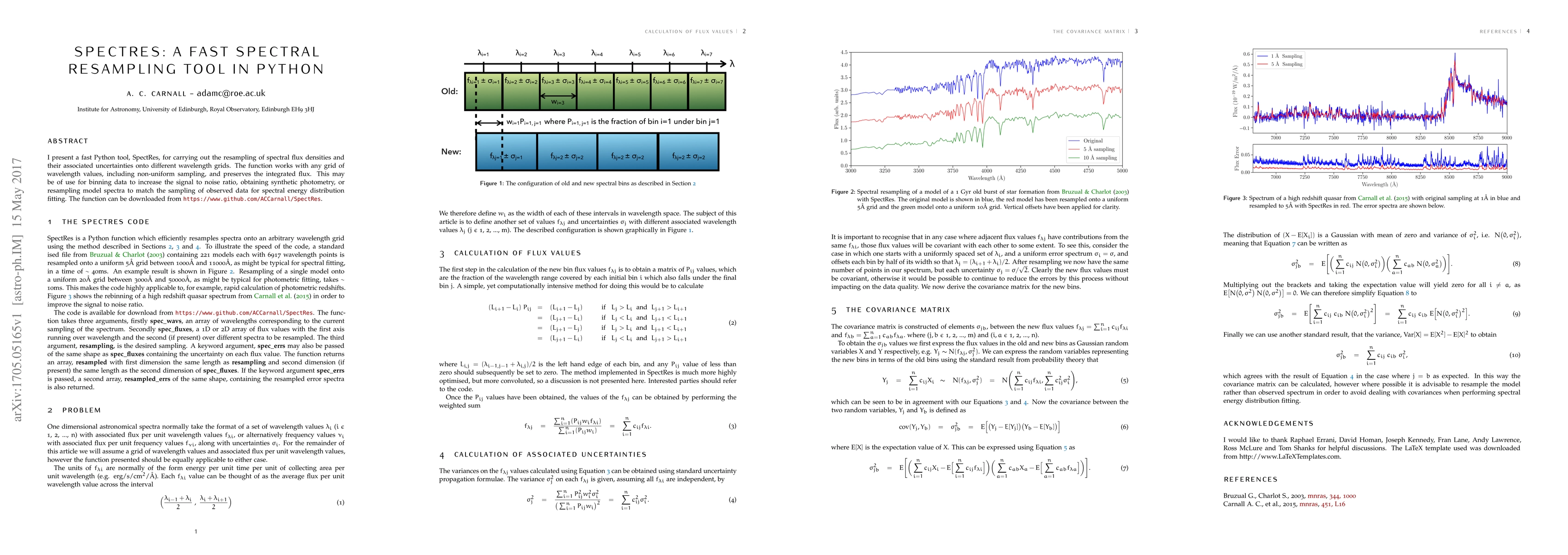 SpectRes is a Python tool designed for efficient spectral resampling of flux densities and uncertainties onto different wavelength grids, supporting non-uniform sampling and preserving integrated flux. It is useful for enhancing signal-to-noise ratios, synthetic photometry, and matching model spectra to observed data.