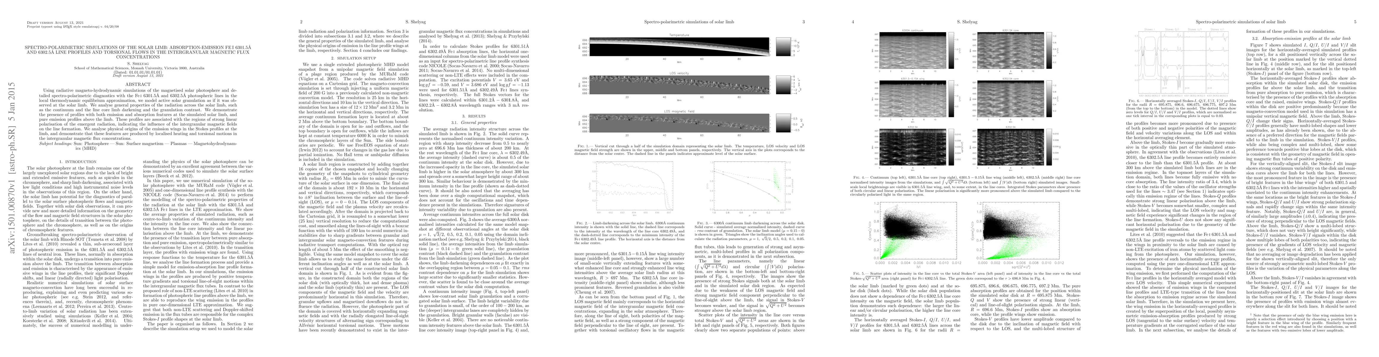 Using radiative magneto-hydrodynamic simulations of the magnetised solar photosphere and detailed spectro-polarimetric diagnostics with the FeI $6301.5\mathrm{\AA}$ and $6302.5\mathrm{\AA}$ photospheric lines in the local thermodynamic equilibrium approximation, we model active solar granulation as if it was observed at the solar limb. We analyse general properties of the radiation across the solar limb, such as the continuum and the line core limb darkening and the granulation contrast. We demonstrate the presence of profiles with both emission and absorption features at the simulated solar limb, and pure emission profiles above the limb. These profiles are associated with the regions of strong linear polarisation of the emergent radiation, indicating the influence of the intergranular magnetic fields on the line formation. We analyse physical origins of the emission wings in the Stokes profiles at the limb, and demonstrate that these features are produced by localised heating and torsional motions in the intergranular magnetic flux concentrations.