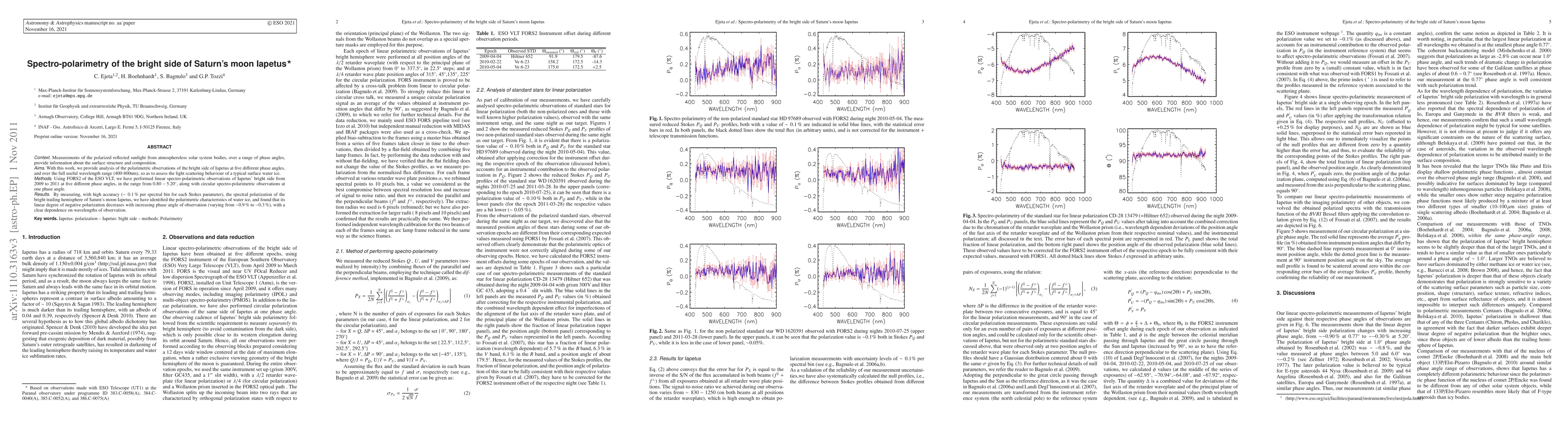 Measurements of the polarized reflected sunlight from atmosphereless solar system bodies, over a range of phase angles, provide information about the surface structure and composition. With this work, we provide analysis of the polarimetric observations of the bright side of Iapetus at five different phase angles, and over the full useful wavelength range (400-800nm), so as to assess the light scattering behaviour of a typical surface water ice. Using FORS2 of the ESO VLT, we have performed linear spectro-polarimetric observations of Iapetus' bright side from 2009 to 2011 at five different phase angles, in the range from 0.80-5.20^{0}, along with circular spectro-polarimetric observations at one phase angle. By measuring, with high accuracy (~0.1% per spectral bin for each Stokes parameter), the spectral polarization of the bright trailing hemisphere of Saturn's moon Iapetus, we have identified the polarimetric characteristics of water ice, and found that its linear degree of negative polarization decreases with increasing phase angle of observation (varying from -0.9% to -0.3%), with a clear dependence on wavelengths of observation.