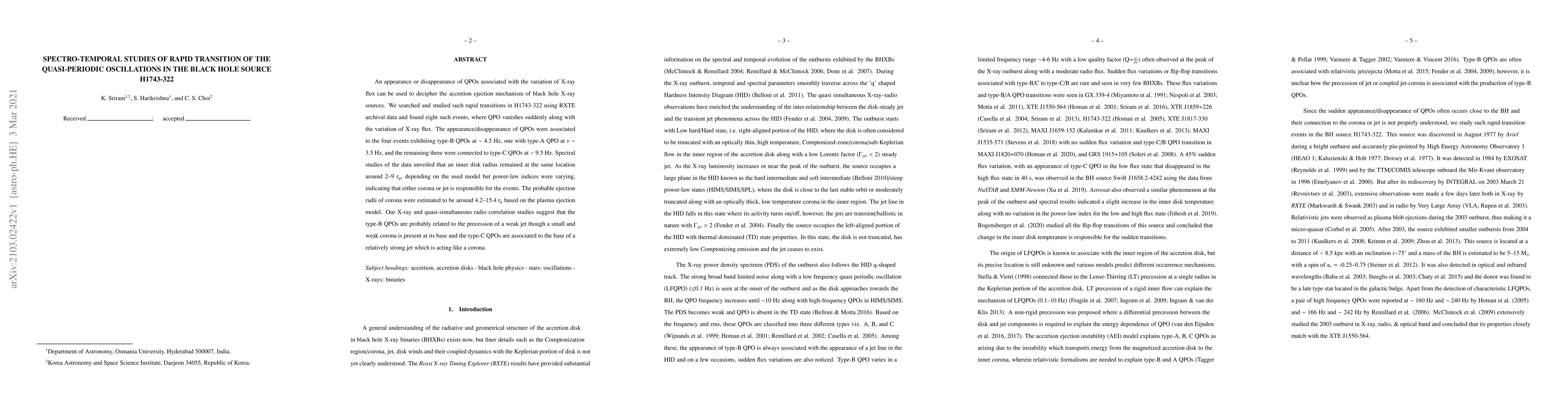 The study analyzed RXTE data from black hole X-ray source H1743-322, identifying eight instances where Quasi-Periodic Oscillations (QPOs) vanished with X-ray flux changes. QPOs were linked to type-B, type-A, and type-C oscillations, each associated with different inner disk radii. Spectral analysis revealed constant inner disk locations but varying power-law indices, suggesting corona or jet involvement. Correlation studies propose type-B QPOs relate to a weak jet's precession, while type-C QPOs connect to a strong jet acting as a corona. Ejection radii for corona were estimated around 4.2-15.4 gravitational radii.