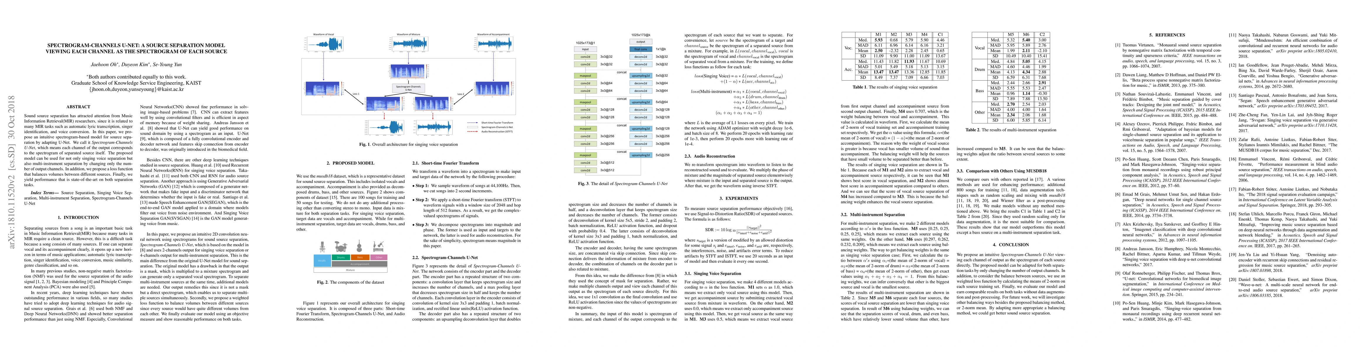 Sound source separation has attracted attention from Music Information Retrieval(MIR) researchers, since it is related to many MIR tasks such as automatic lyric transcription, singer identification, and voice conversion. In this paper, we propose an intuitive spectrogram-based model for source separation by adapting U-Net. We call it Spectrogram-Channels U-Net, which means each channel of the output corresponds to the spectrogram of separated source itself. The proposed model can be used for not only singing voice separation but also multi-instrument separation by changing only the number of output channels. In addition, we propose a loss function that balances volumes between different sources. Finally, we yield performance that is state-of-the-art on both separation tasks.