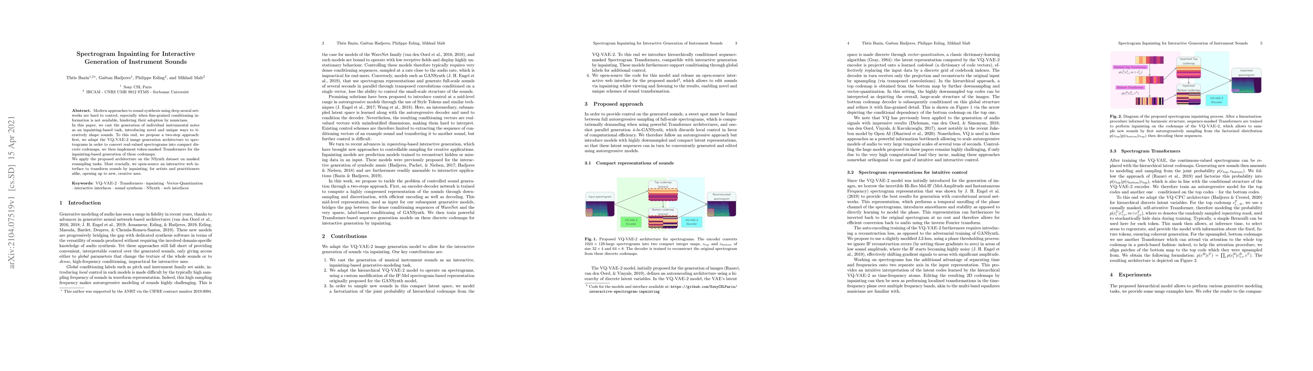 This paper proposes a spectrogram inpainting method for generating and manipulating instrument sounds using a VQ-VAE-2 and Transformer architecture. The approach enables fine-grained control over sound synthesis, offering an interactive web interface for musicians and artists to creatively shape instrument sounds.