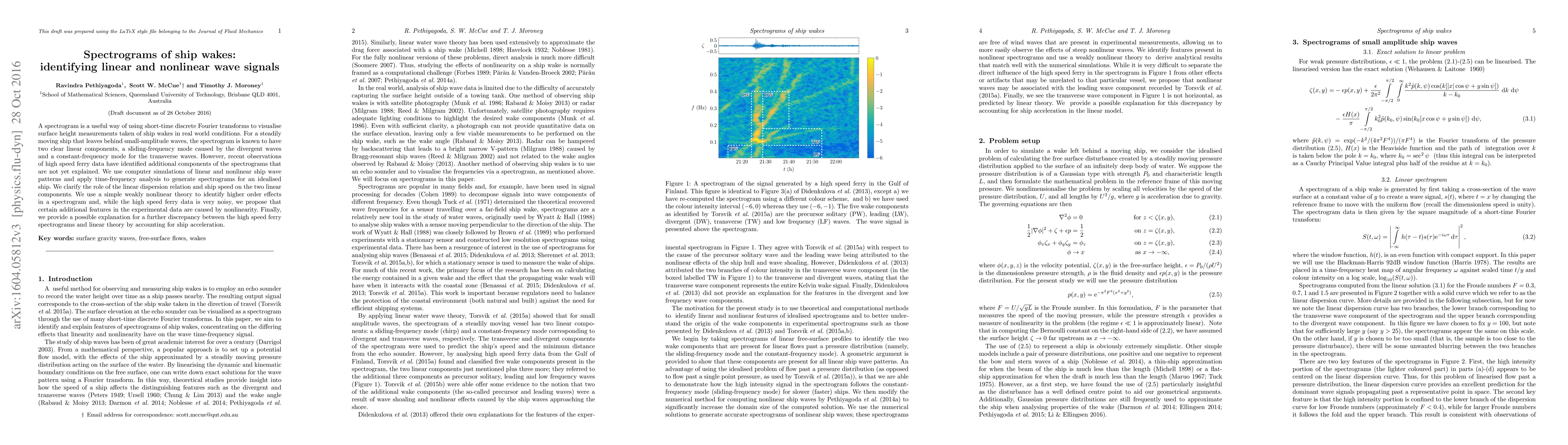 A spectrogram is a useful way of using short-time discrete Fourier transforms to visualise surface height measurements taken of ship wakes in real world conditions. For a steadily moving ship that leaves behind small-amplitude waves, the spectrogram is known to have two clear linear components, a sliding-frequency mode caused by the divergent waves and a constant-frequency mode for the transverse waves. However, recent observations of high speed ferry data have identified additional components of the spectrograms that are not yet explained. We use computer simulations of linear and nonlinear ship wave patterns and apply time-frequency analysis to generate spectrograms for an idealised ship. We clarify the role of the linear dispersion relation and ship speed on the two linear components. We use a simple weakly nonlinear theory to identify higher order effects in a spectrogram and, while the high speed ferry data is very noisy, we propose that certain additional features in the experimental data are caused by nonlinearity. Finally, we provide a possible explanation for a further discrepancy between the high speed ferry spectrograms and linear theory by accounting for ship acceleration.