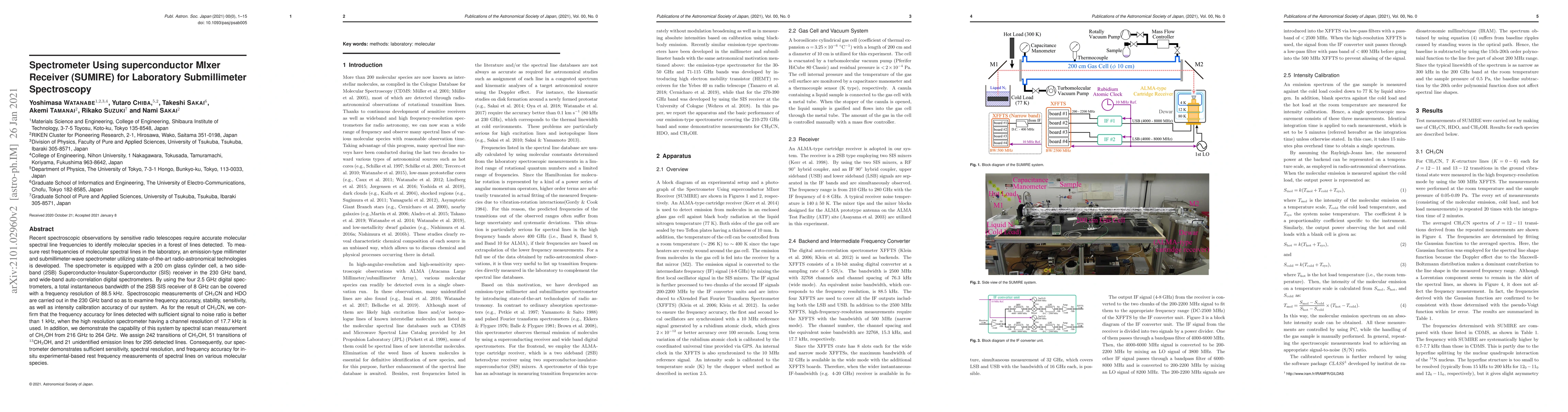 This paper describes the development of a high-resolution spectrometer for laboratory submillimeter spectroscopy using a SUMIRE receiver, achieving frequency accuracy better than 1 kHz for CH$_3$CN. The system successfully identifies numerous molecular transitions in CH$_3$OH, demonstrating its capability for accurate molecular spectral line measurements.